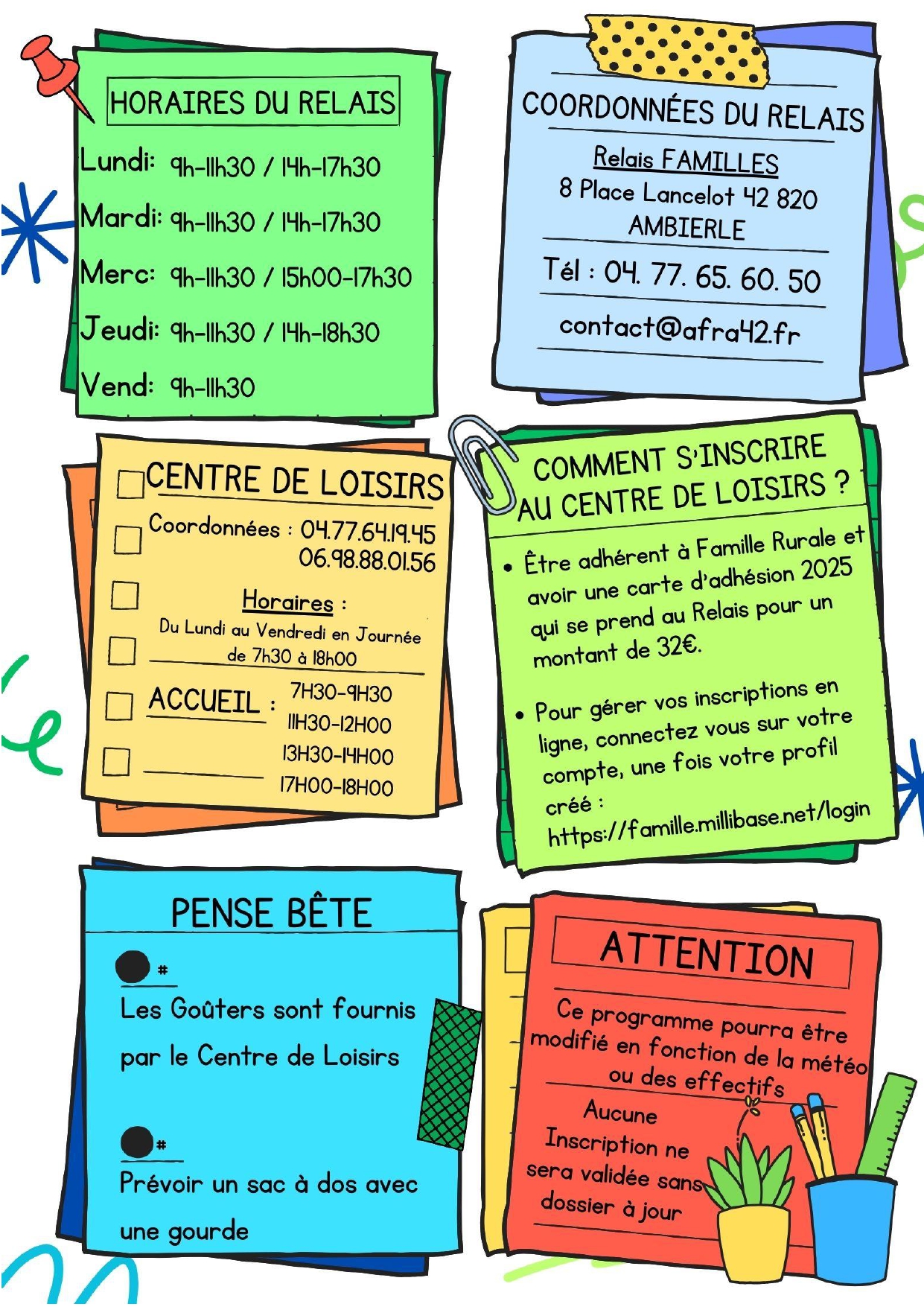 Pour plus d'informations rendez vous dans la rubrique "accueil de loisirs : notre accueil de loisirs", venez nous voir au Relais Familles Rurales ou appelez nous au 04 77 65 60 50