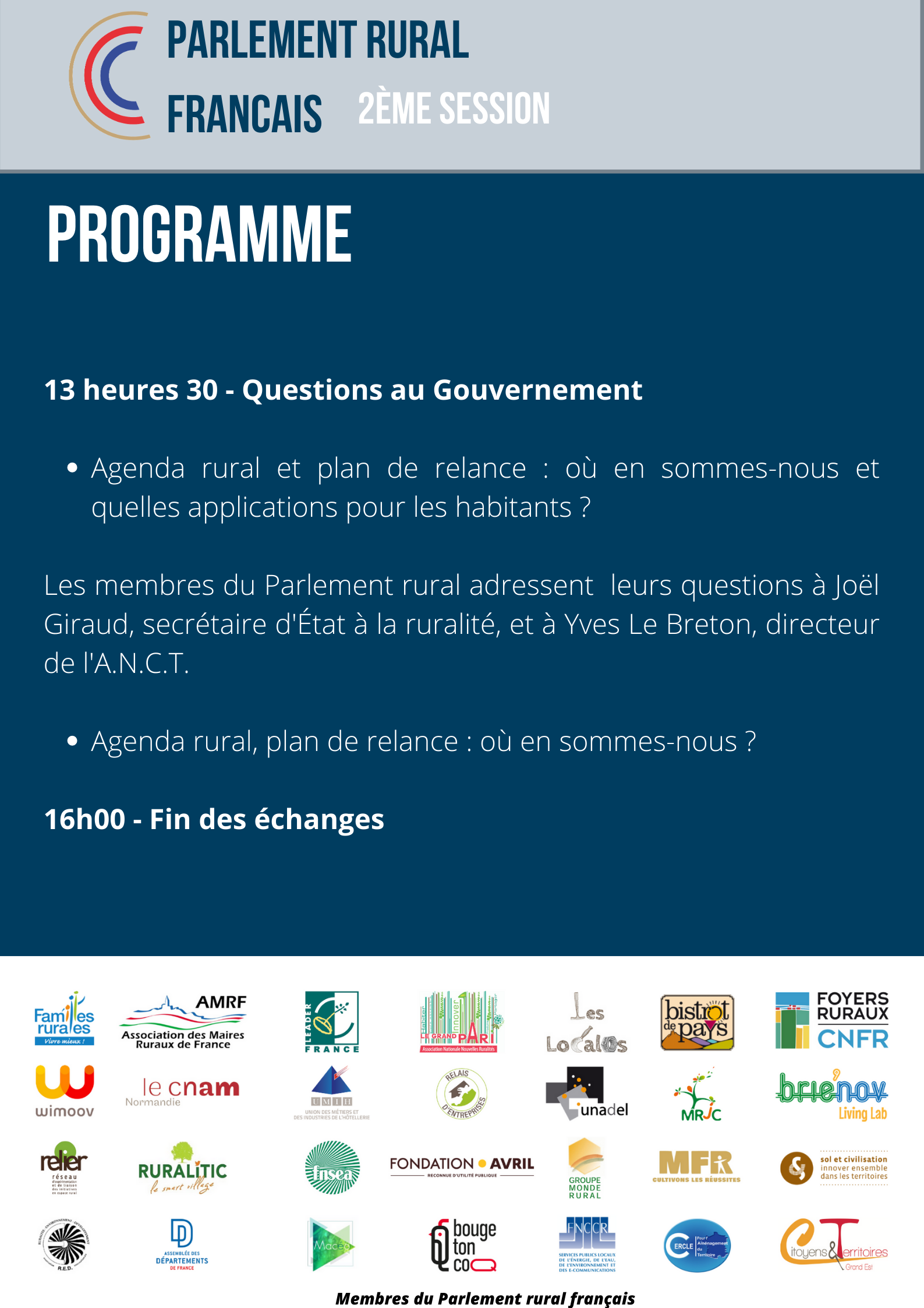 Centrée autour d'un temps de "questions au gouvernement", cette rencontre offrira la possibilité aux membres du P.R.F. de questionner directement Joël Giraud, secrétaire d'État en charge de la ruralité, et Yves Le Breton, directeur de l'Agence nationale de cohésion des territoires.