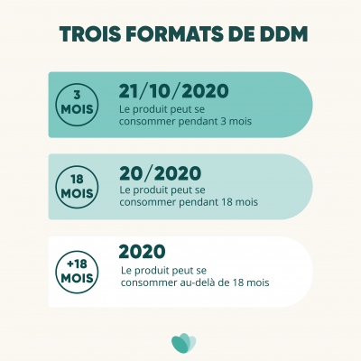 La DDM Date de Durabilité Minimale, correspond à la mention “à consommer de préférence avant le/fin” : c’est une date indicative, après laquelle le produit peut perdre en qualité mais ne présente pas de risque pour la santé. Passé cette date, le produit peut être consommé. On retrouve cette date sur les produits secs ou congelés : pâtes, farine, biscuits, conserves...