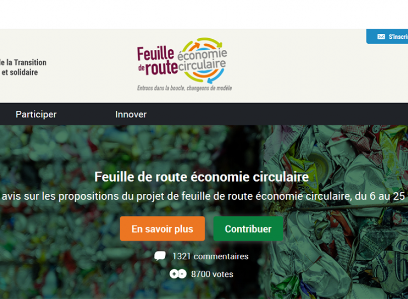 Donnez votre avis sur le projet de document de la feuille de route de l'économie circulaire. Vos contributions permettront de finaliser la feuille de route de l'économie circulaire qui sera publiée officiellement début mars 2018.