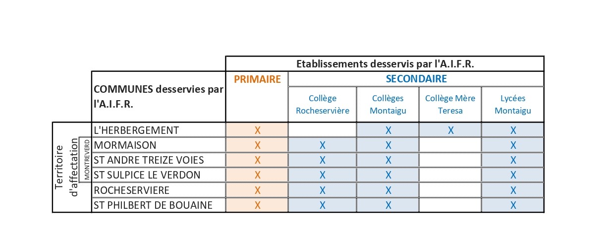 Les associations communales historiquement organisatrices du Transport Scolaire sur le secteur de Rocheservière* se sont regroupées depuis 2015 sous l'A.I.F.R., Association Intercommunale Familles Rurales.
