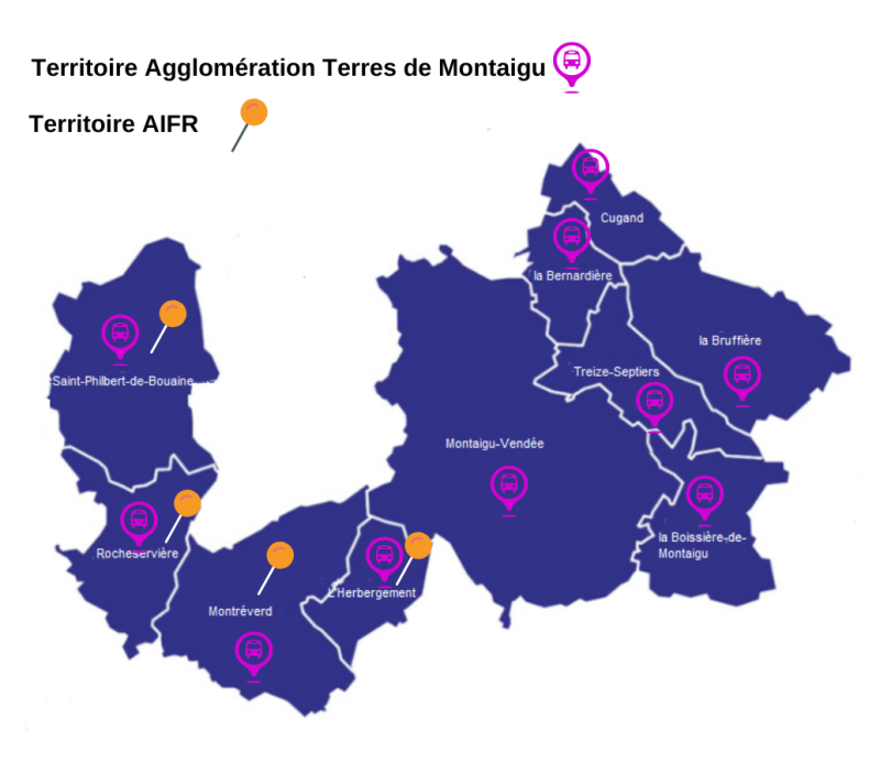 Depuis le 01 Janvier 2023, l'A.I.F.R. est chargée, pour le compte de la Communauté d'Agglomération Terres de Montaigu, de coordonner le transport scolaire des élèves du primaire et du secondaire du territoire de l'ex-Communauté de Communes du canton de Rocheservière. Ce partenariat entre la Communauté d'Agglomération (organisateur principal) et l'association (organisateur secondaire) est officialisé par une convention.L'AIFR a signé une délégation de compétences avec l'Agglomération Terres de Montaigu et reste l'organisateur secondaire (AO2) pour les usagers des communes de Montréverd, l'Herbergement, Saint-Philbert-de-Bouaine, Rocheservière.
