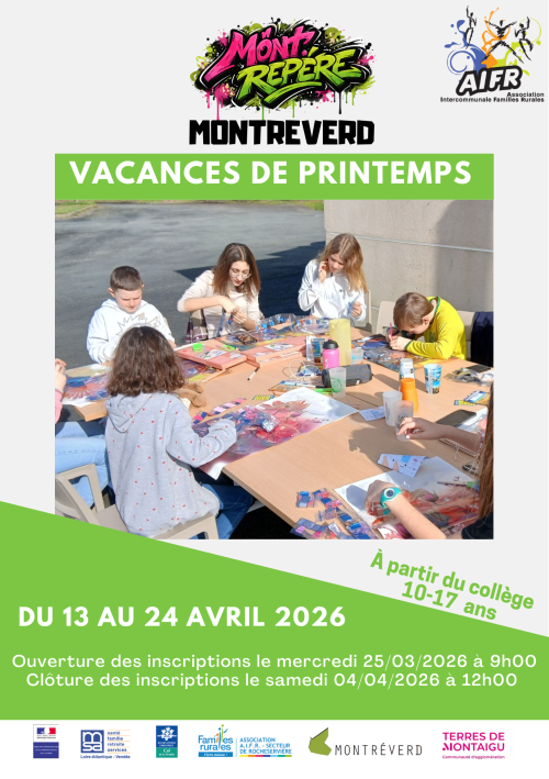 Le dossier d'inscription est à retourner en Mairie de Saint-André-Treize-Voies, à l'attention de l'animatrice jeunesse ou à envoyer par mail à : anim.montreverd@aifr.frAttention ! Les places sont limitées, elles sont attribuées par ordre d'arrivée (dossier complet) et non par sélection sur dossier. Un jeune non retenu sur une période sera prioritaire sur les prochaines missions proposées.