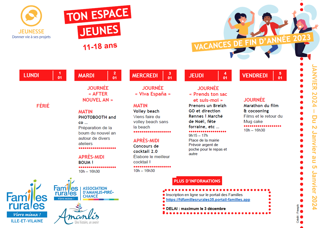 Vacances de fin d'année 2023Durant cette période de vacances de fin d'année, les places sont limitées à 12 jeunes chaque jour car il y a un seul animateur présent sur cette tranche d'âge. Voici le programme d'animation : En savoir plus EJ Familles Rurales Amanlis - Vacances Noël 2023.pdf471.86 Ko