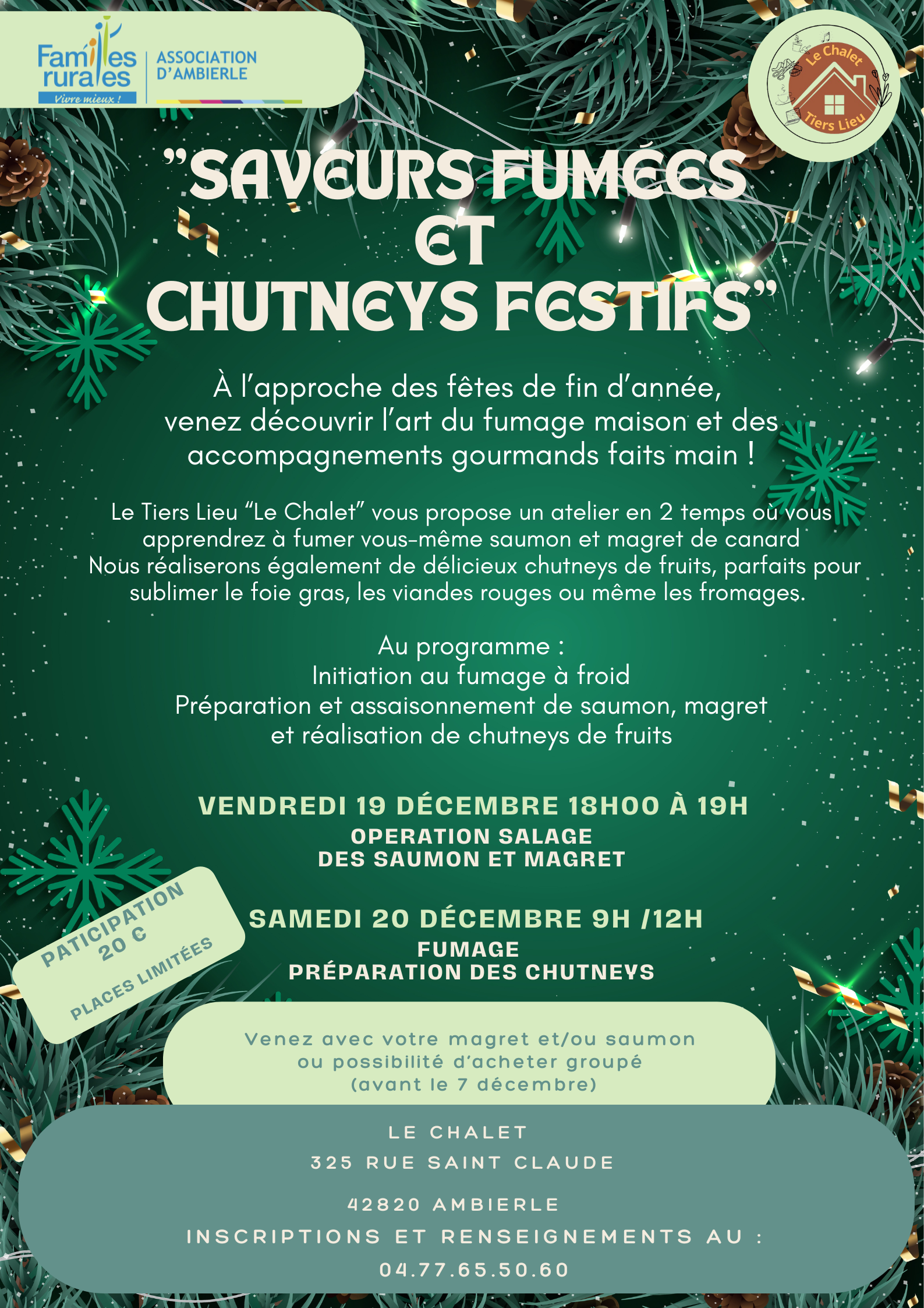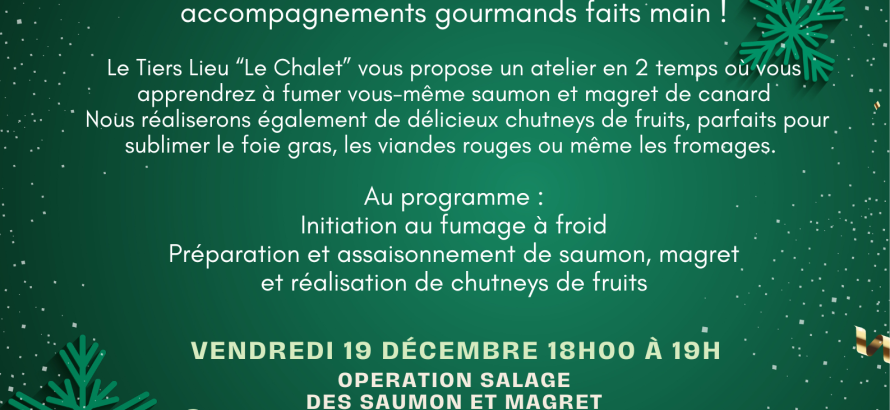 Le Tiers Lieu “Le Chalet” vous propose un atelier en 2 temps où vous apprendrez à fumer vous-même saumon et magret de canard.