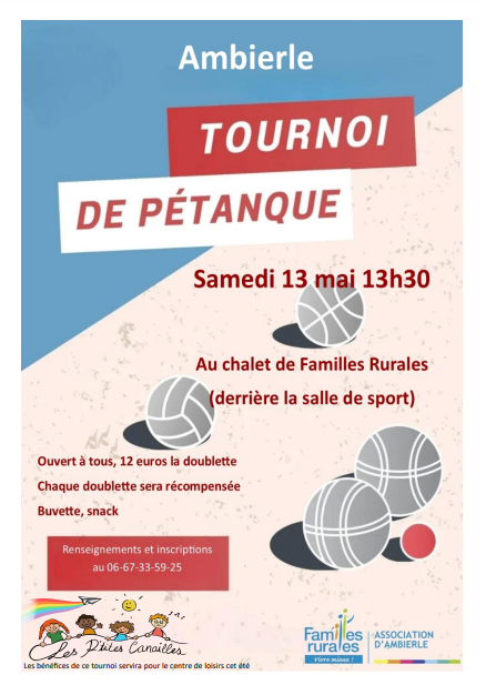 Le centre de loisirs vous invite à son tournoi de pétanque le 13/05 à 13h30 au Chalet