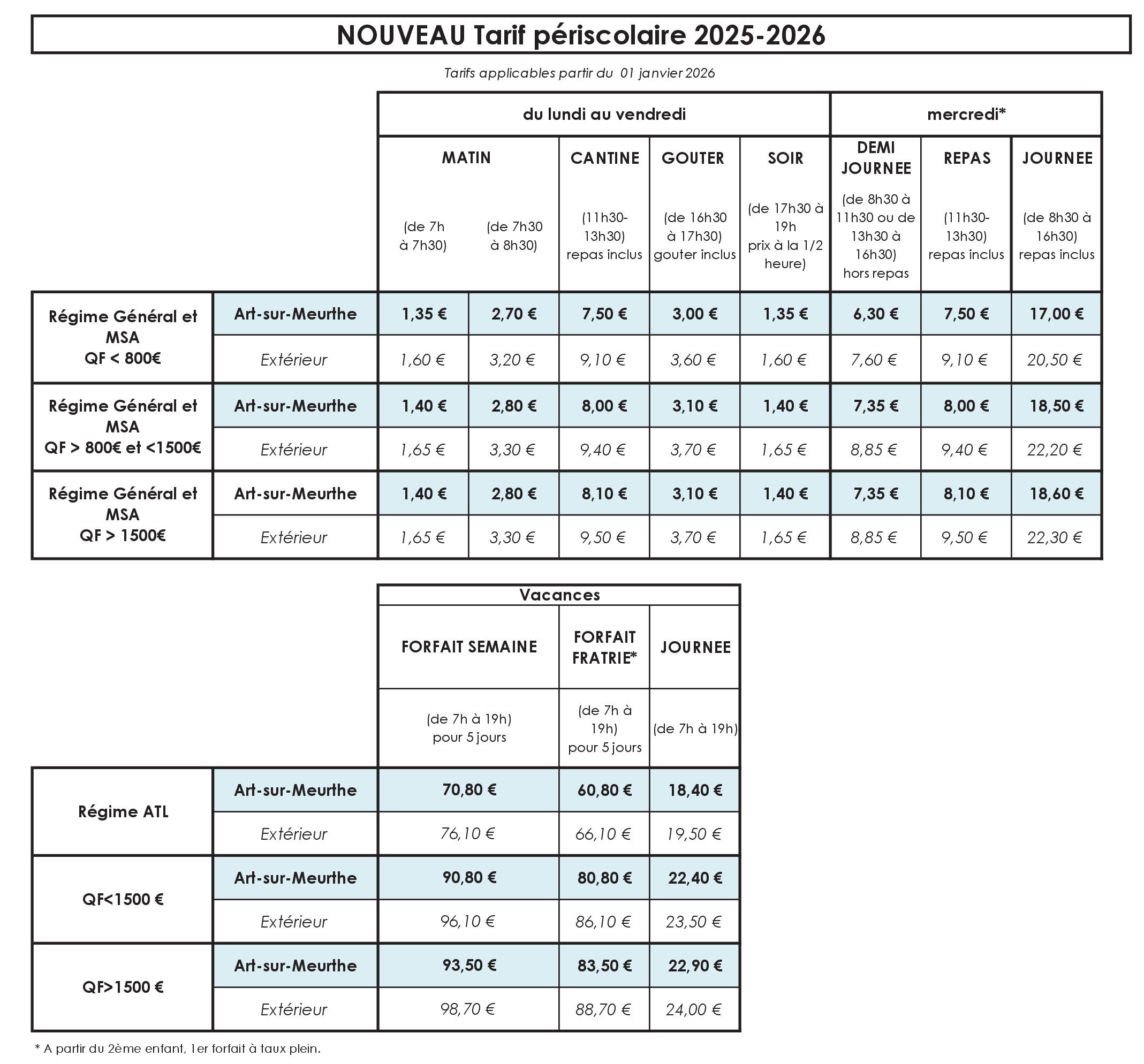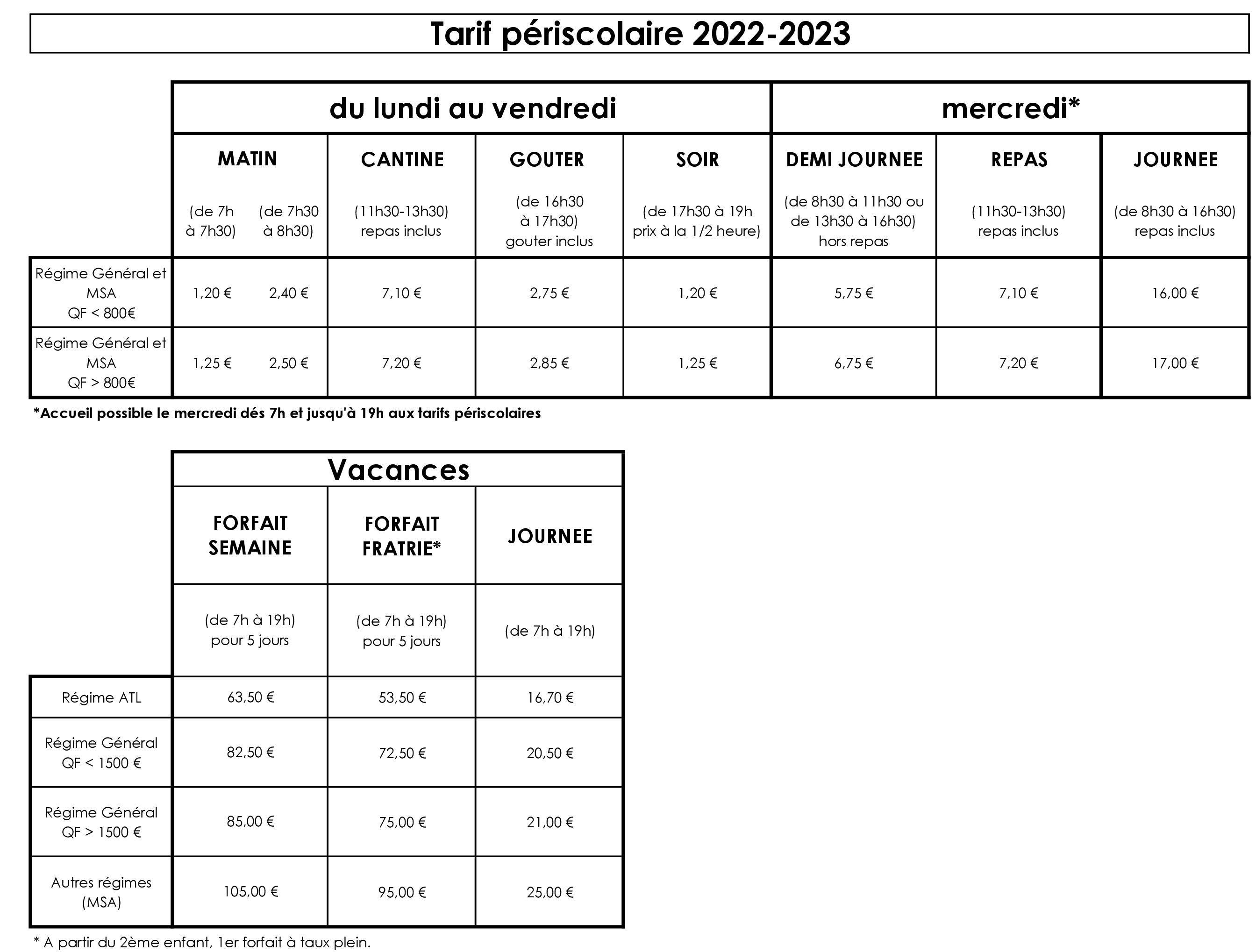 Présentation Dossier d'inscription Horaires et tarifs Menus du périscolaire Grille des tarifs 2025-2026 :