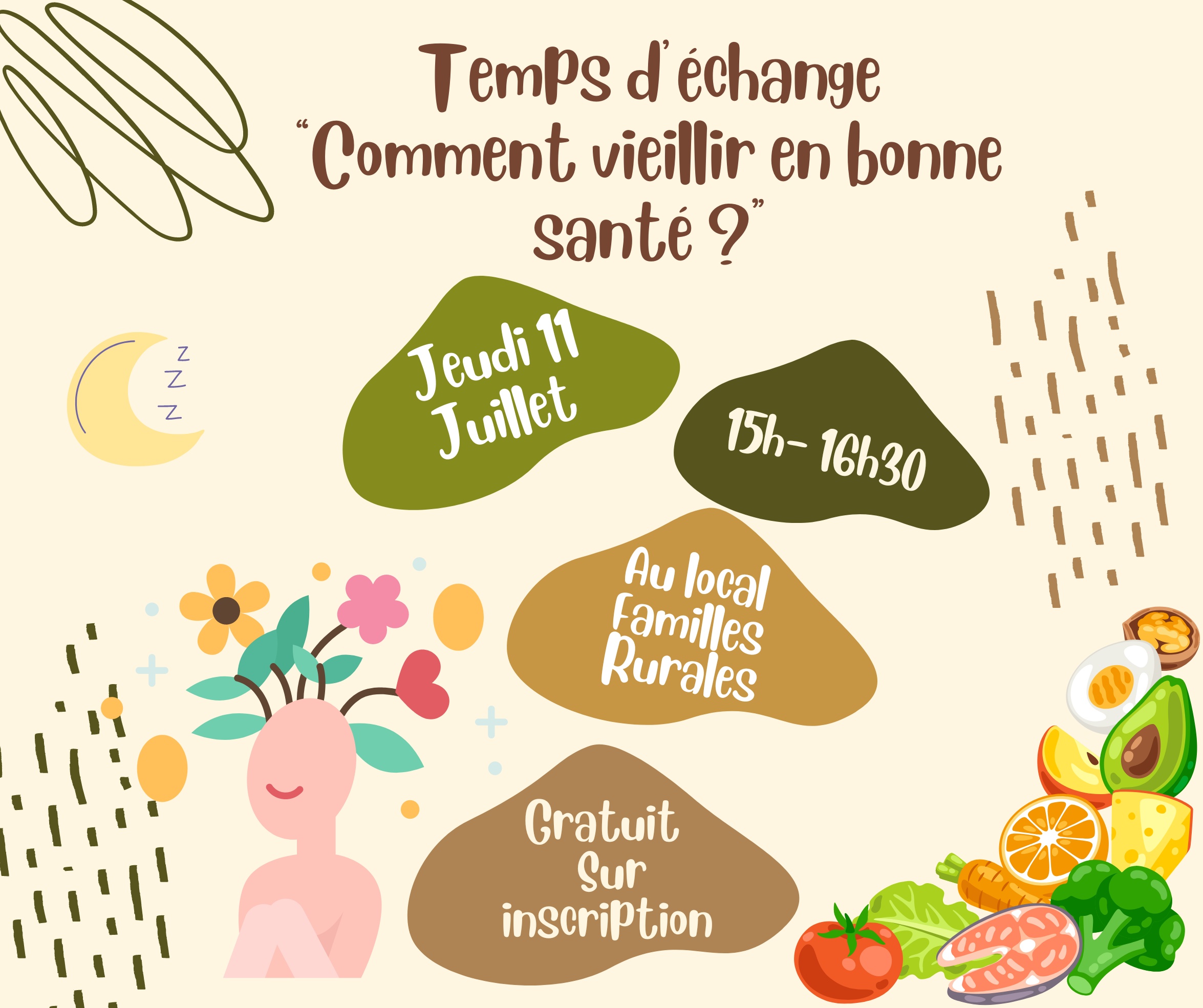 Le Jeudi 11 Juillet de 15h à 16h30 nous organisons un temps d'échange animé par une professionnelle : Comment vieillir en bonne santé ?