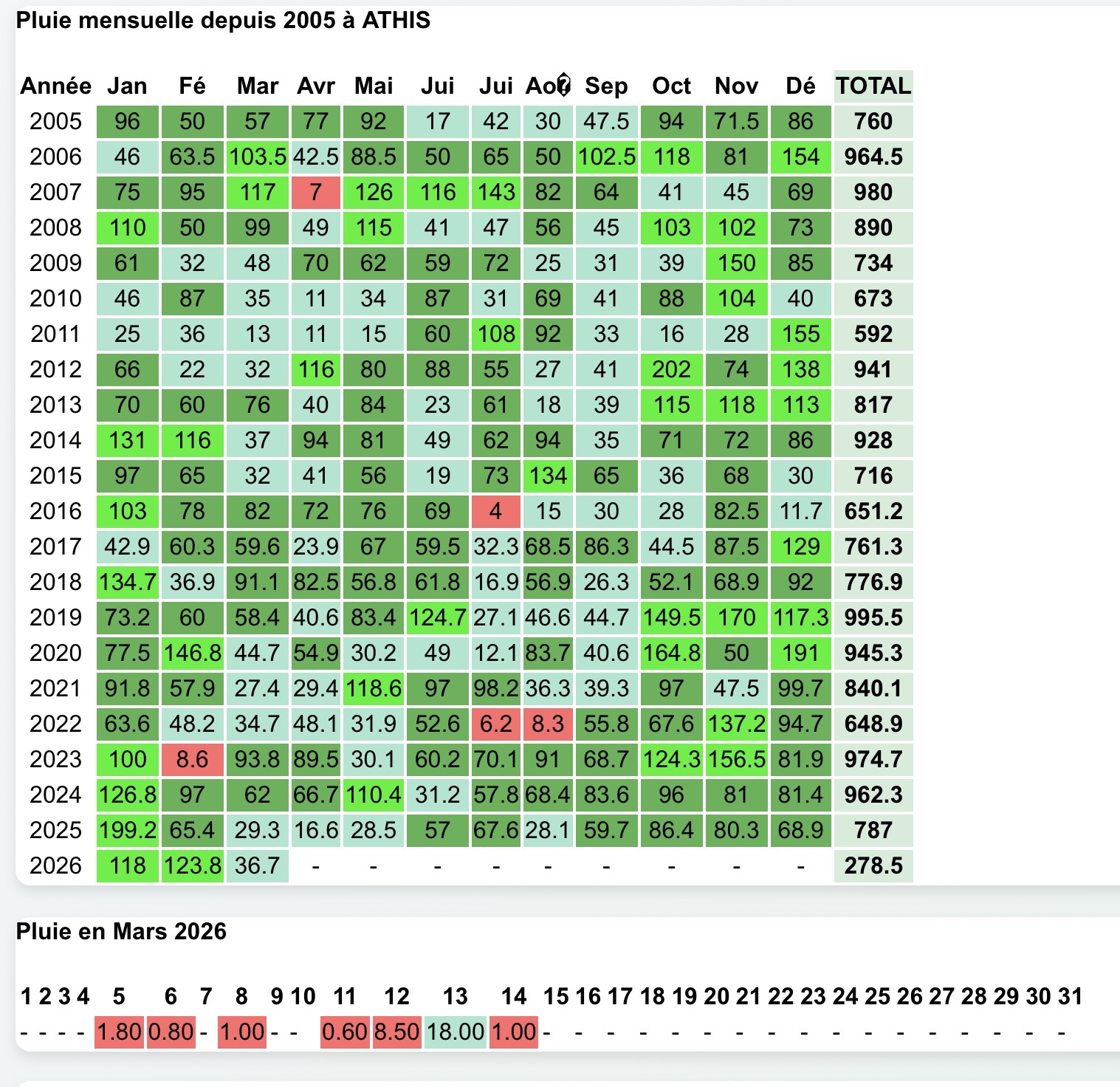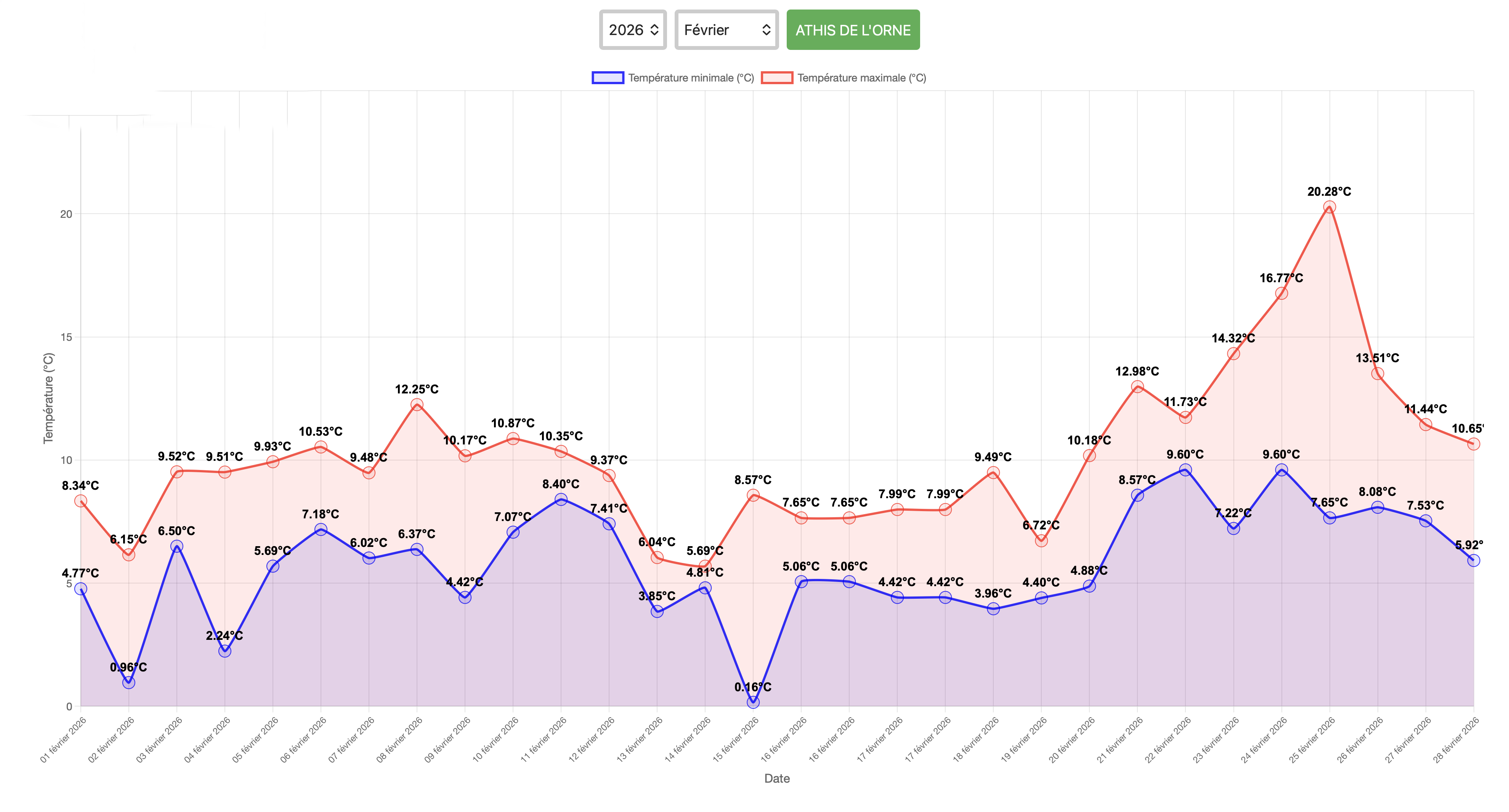Dernière mise à jour : 15 mars 2026 à 8h30' En savoir plus Pluviométrie depuis 20051.23 Mo Températures du mois de février 2026 à Athis977.15 Ko Évolution des températures à ATHIS DE L'ORNE depuis 2017919.81 Ko