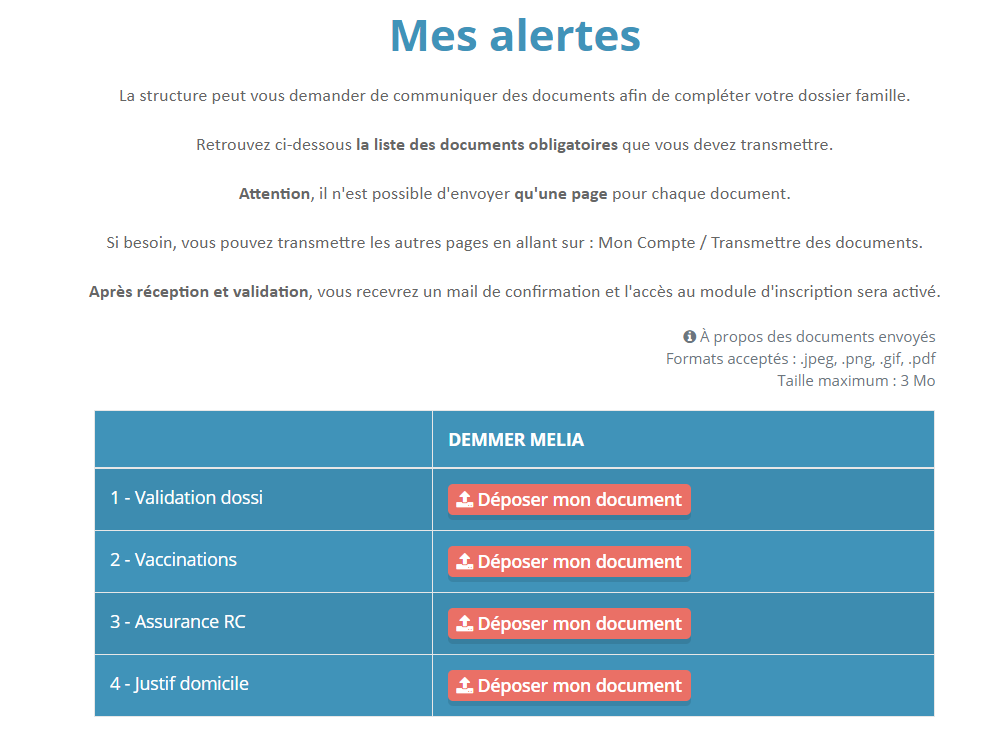 - le profil et le dossier sont complets: les 4 documents ont été transmis, les 3 onglets du profil de l'enfant ont été complétés (fiche d'information, personnes autorisées ou non, fiche médicale/sanitaire avec les dates des vaccins à jour) et validées par la structure, la photo a été ajoutée.