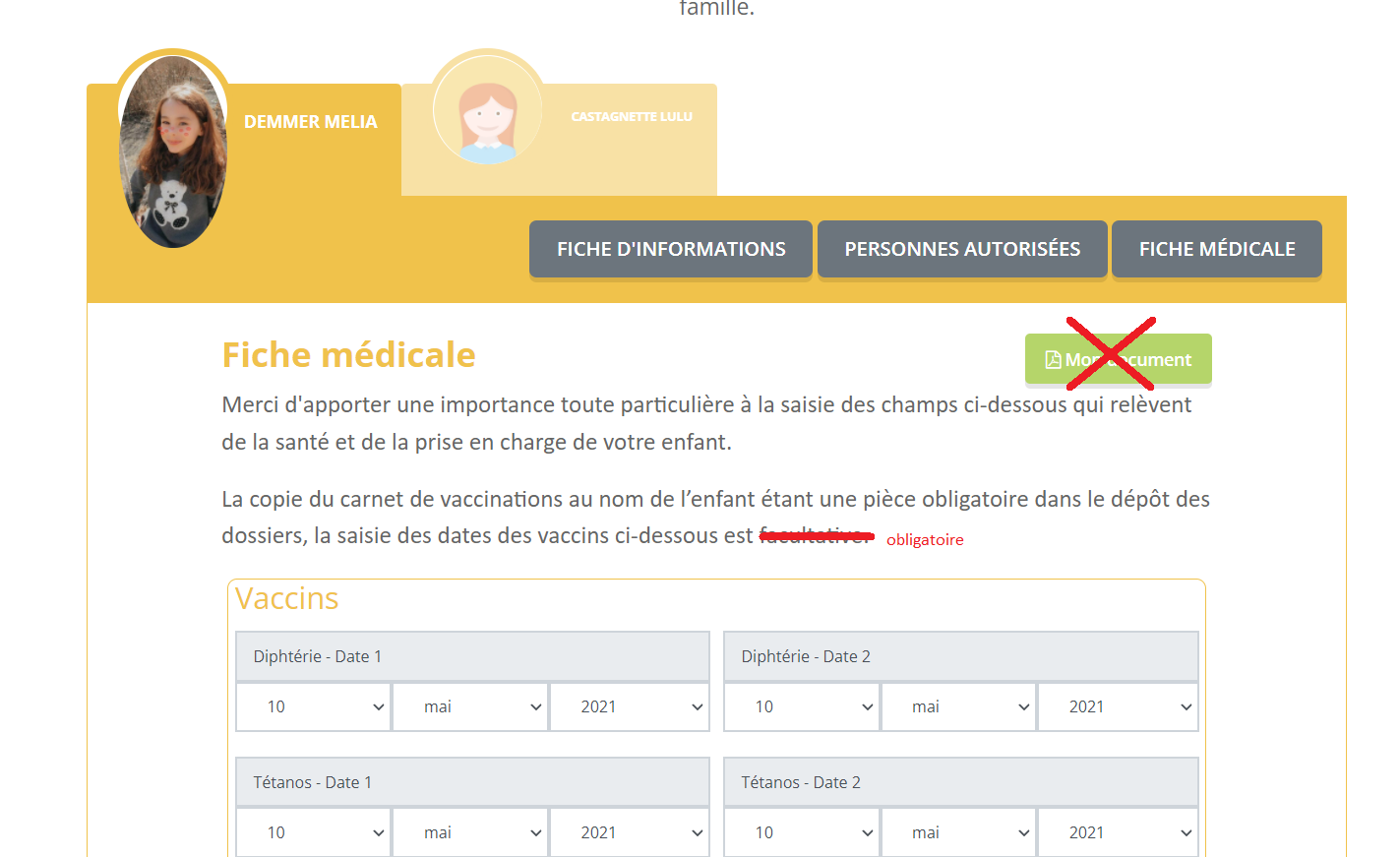 8/ Dans le 3° onglet: FICHE MEDICALE. Inscrivez obligatoirement les dates des vaccins inscrites dans le carnet de santé de l'enfant. En effet, les photos de vaccins transmises ne permettent pas à la structure une lecture claire des données.