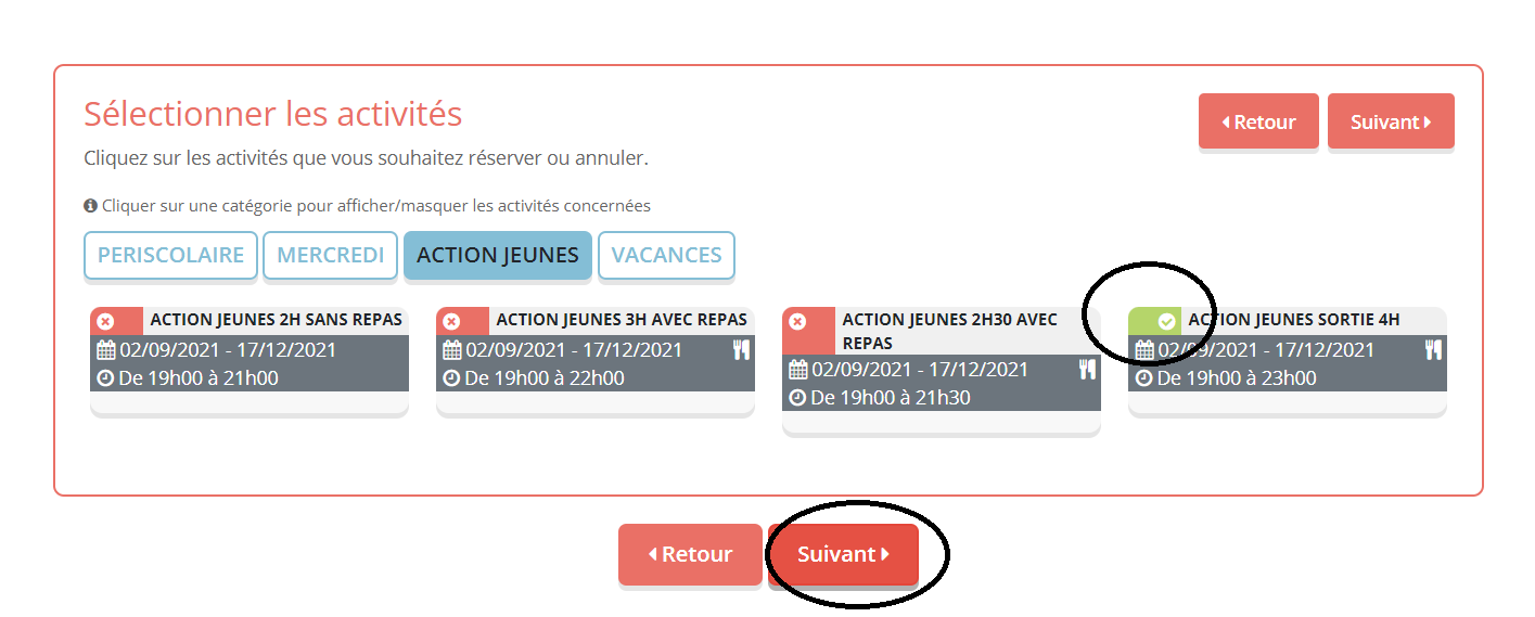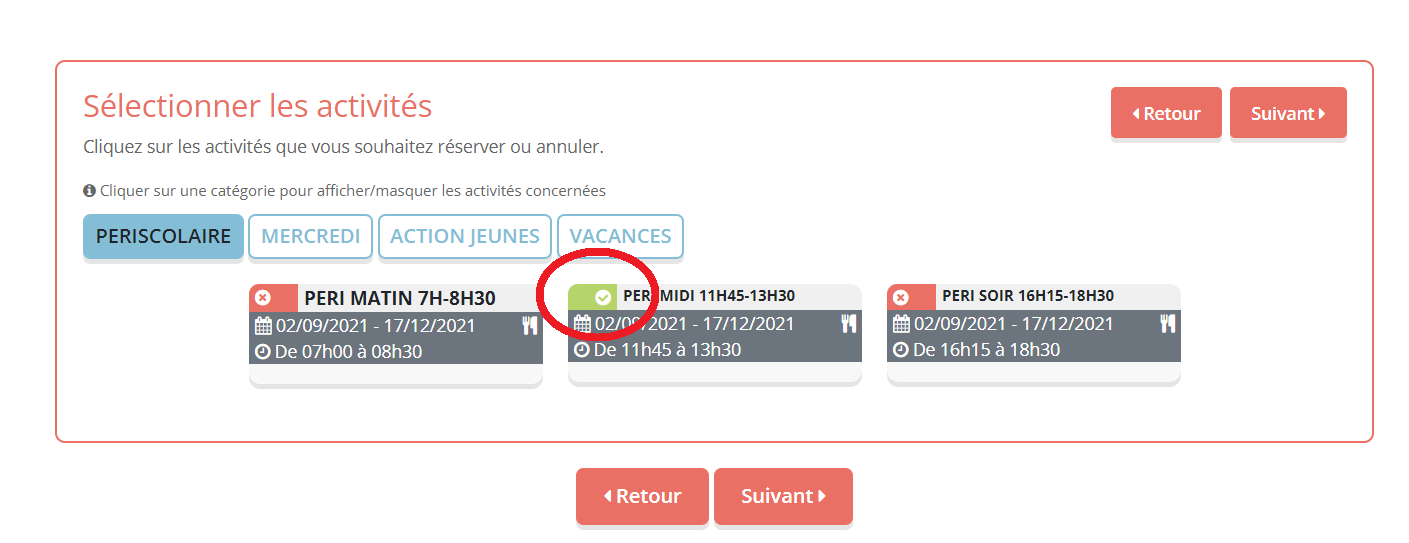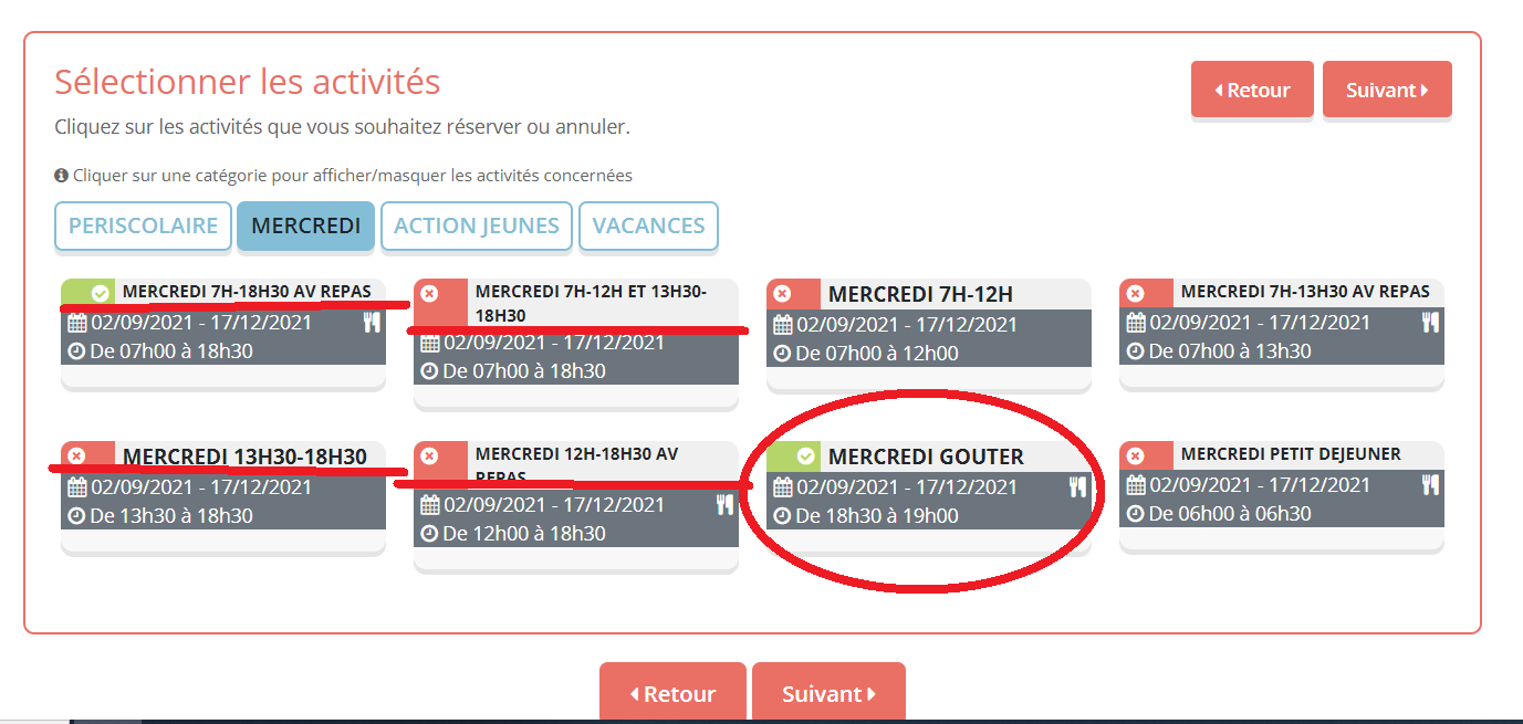 3/ Choisissez ensuite le/les créneaux qui vous intéresse. Sélectionnez l'icone rouge avec une croix, elle passe au vert avec un petit rond validation. Cliquez sur suivant.