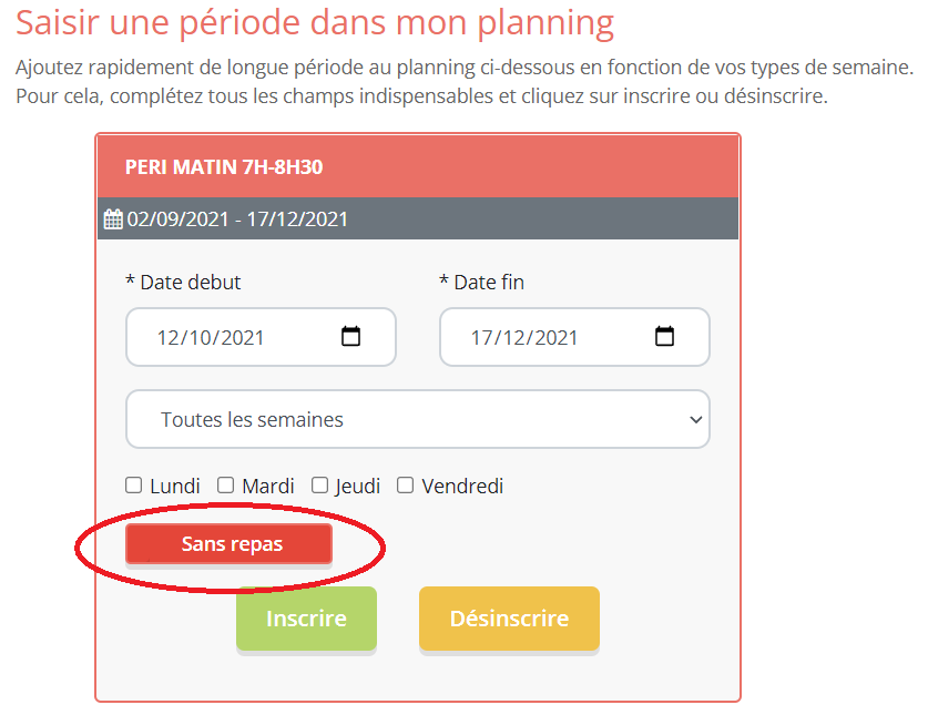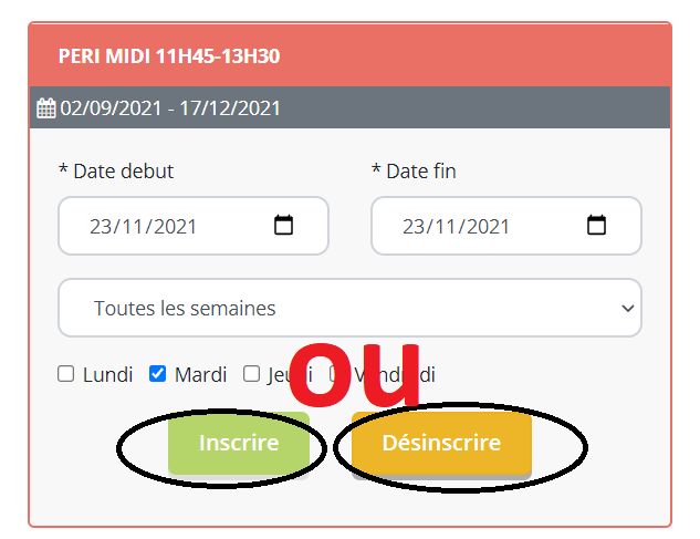 4/ Dans le bloc correspondant, sélectionner la/les date(s) concernés, les semaines paires ou impairs si besoin, le(s) jour(s) de la semaine. Choisissez inscrire ou désinscrire.