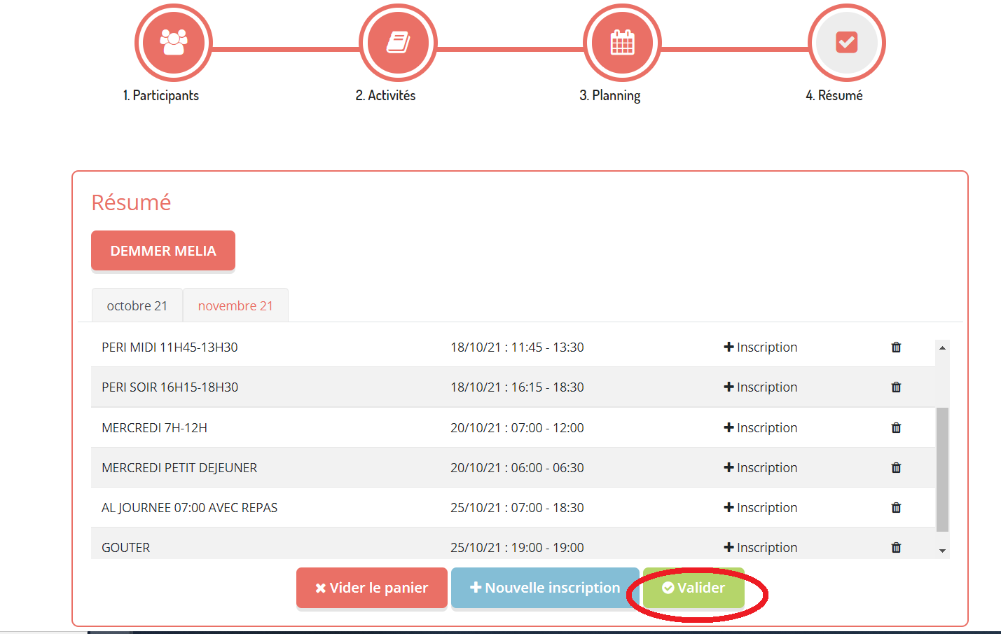 Elle valide, après passage en dossier complet, les sélections de créneaux validés dans le panier des familles sur le Portail.