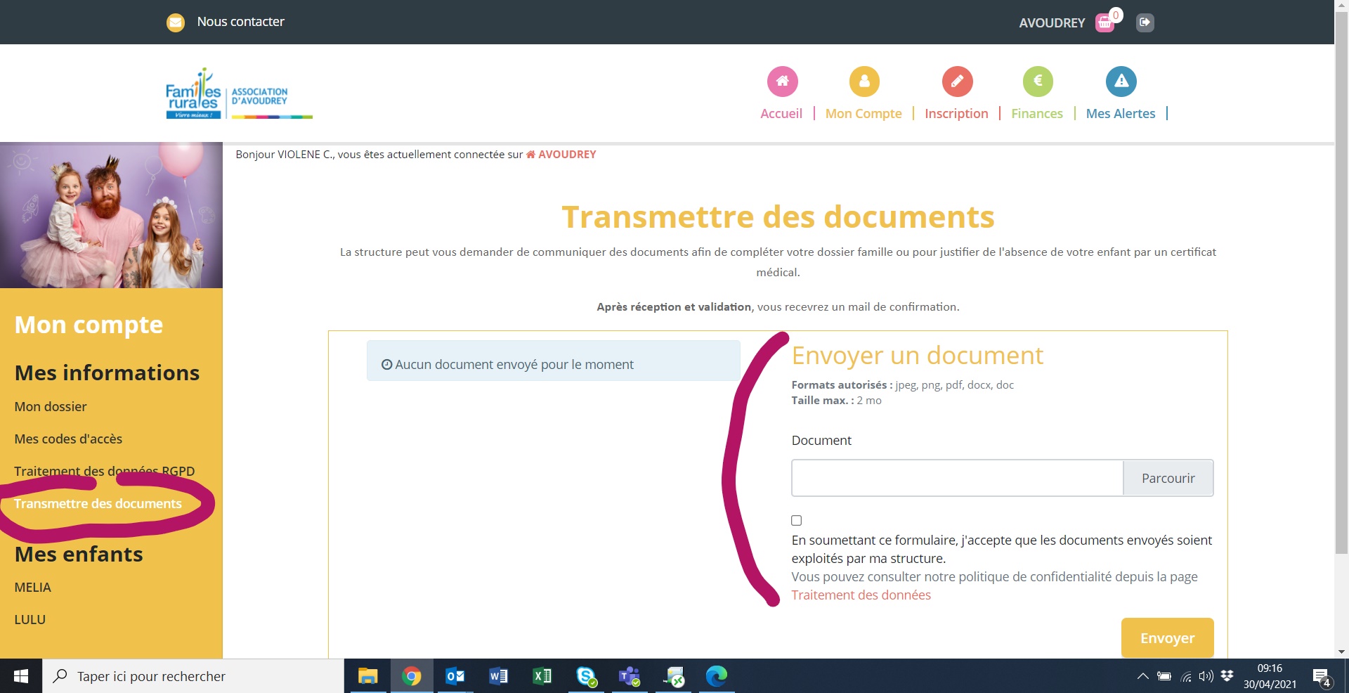 **Attention: si vous avez plusieurs pages il faudra passer les autres pages une à une par la rubrique "mon comte" puis "transmettre des documents".