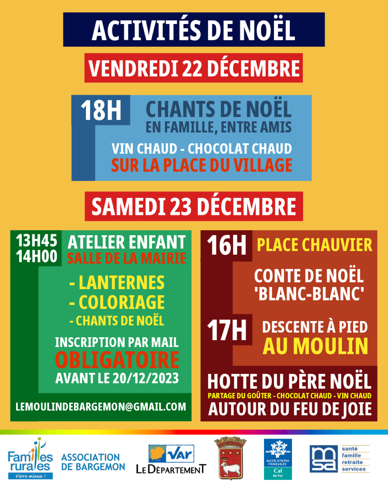 - Atelier enfant lanternes, coloriages, chants de Noël [INSCRIPTION PAR MAIL OBLIGATOIRE AVANT LE 20/12/2023 PAR MAIL : lemoulindebargemon@gmail.com]