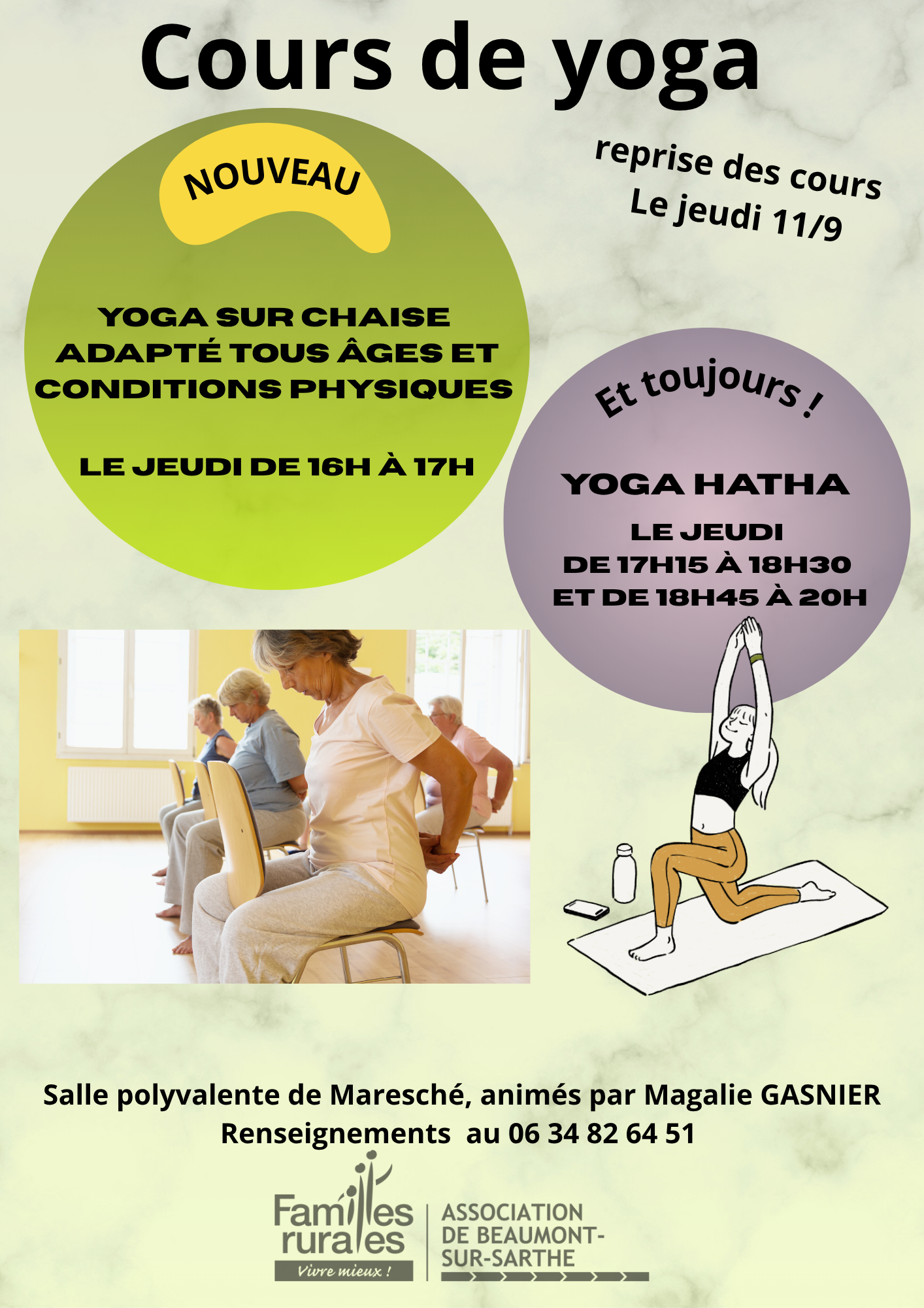 Bulletin d'adhésion 2026 à apporter complété, avec le chèque d'adhésion, plus le ou les chèques (si règlement en 3 fois) pour l'activité yoga, à l'ordre de Familles Rurales et à remettre au référent lors du cours.