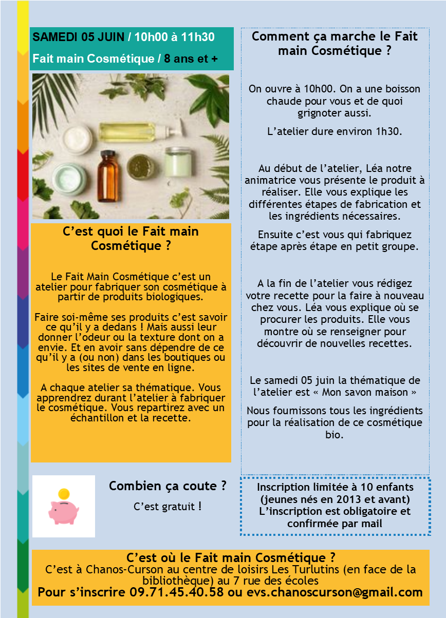 NOUVELLE ÉDITION DE NOTRE JOURNÉE VERTE ! Cette année trois ateliers thématiques pour valoriser le fait maison, le consommer autrement, le partage. Au centre de loisirs pour les plus de 6 ans le 05 juin à 10h00. Inscription obligatoire.