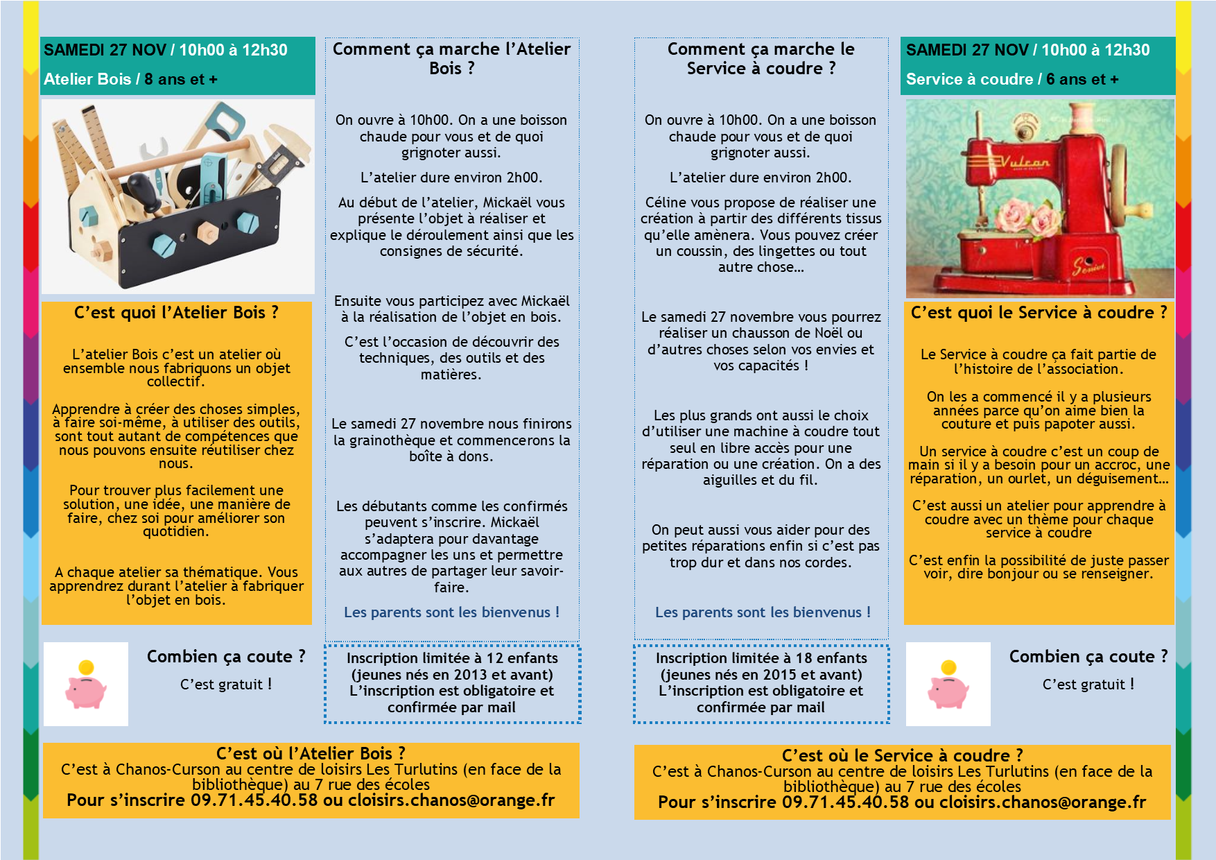 Venez profitez des ateliers gratuits du samedi 27 novembre ! Bois ? Couture ? Il n'y a plus qu'à choisir... Pour s'inscrire : envoyez un mail ou appelez. 24 novembre 2021