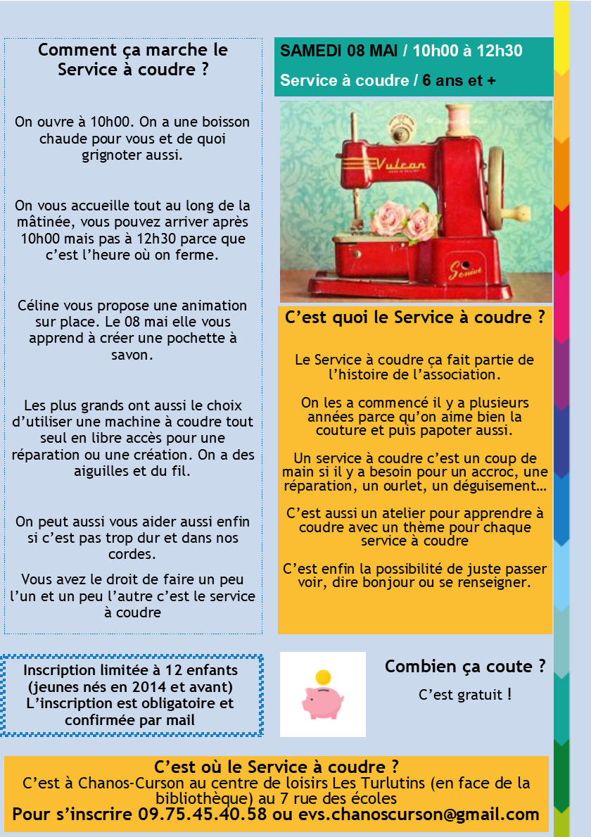 Nous sommes heureux de proposer un nouvel atelier Couture le samedi 08 mai de 10h00 à 12h30 au Centre de Loisirs. Céline animera un atelier couture à thème : La pochette à savon.