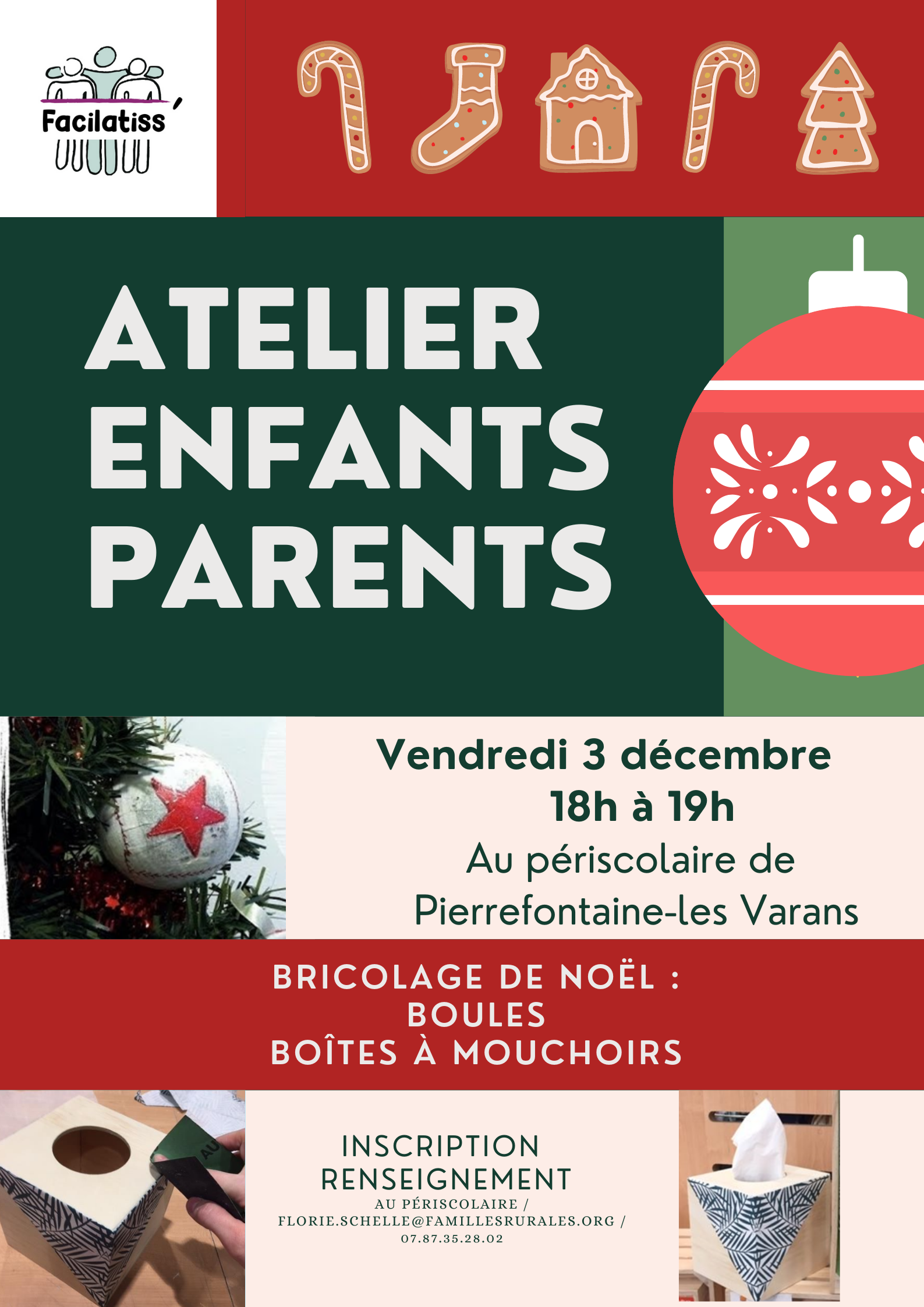 Ce vendredi 3 décembre de 18h à 19h au périscolaire de Pierrefontaine, à lieu un atelier enfants parents.