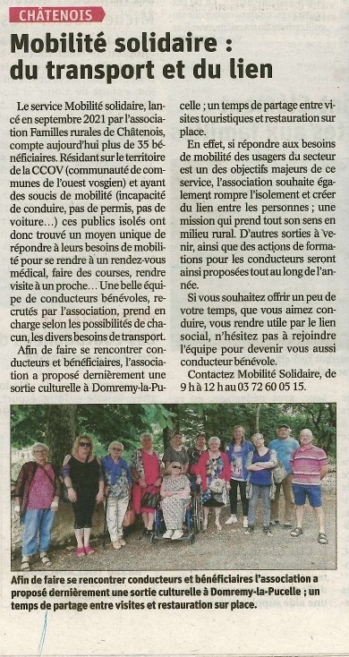 Mobilité Solidaire service lancé en Septembre 2021 par l’Association Familles Rurales de Châtenois compte aujourd'hui plus de 35 Bénéficiaires.