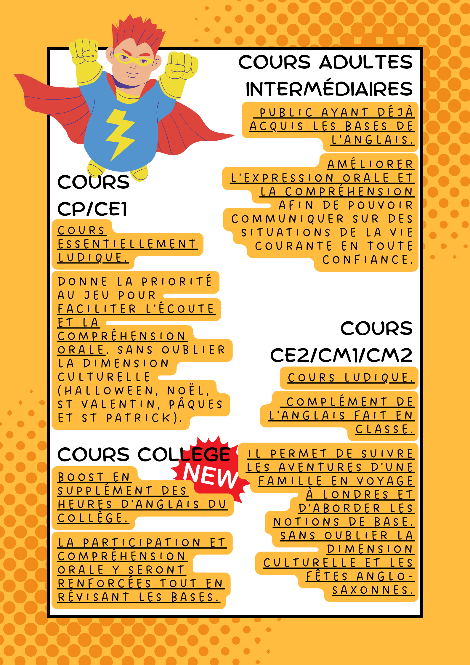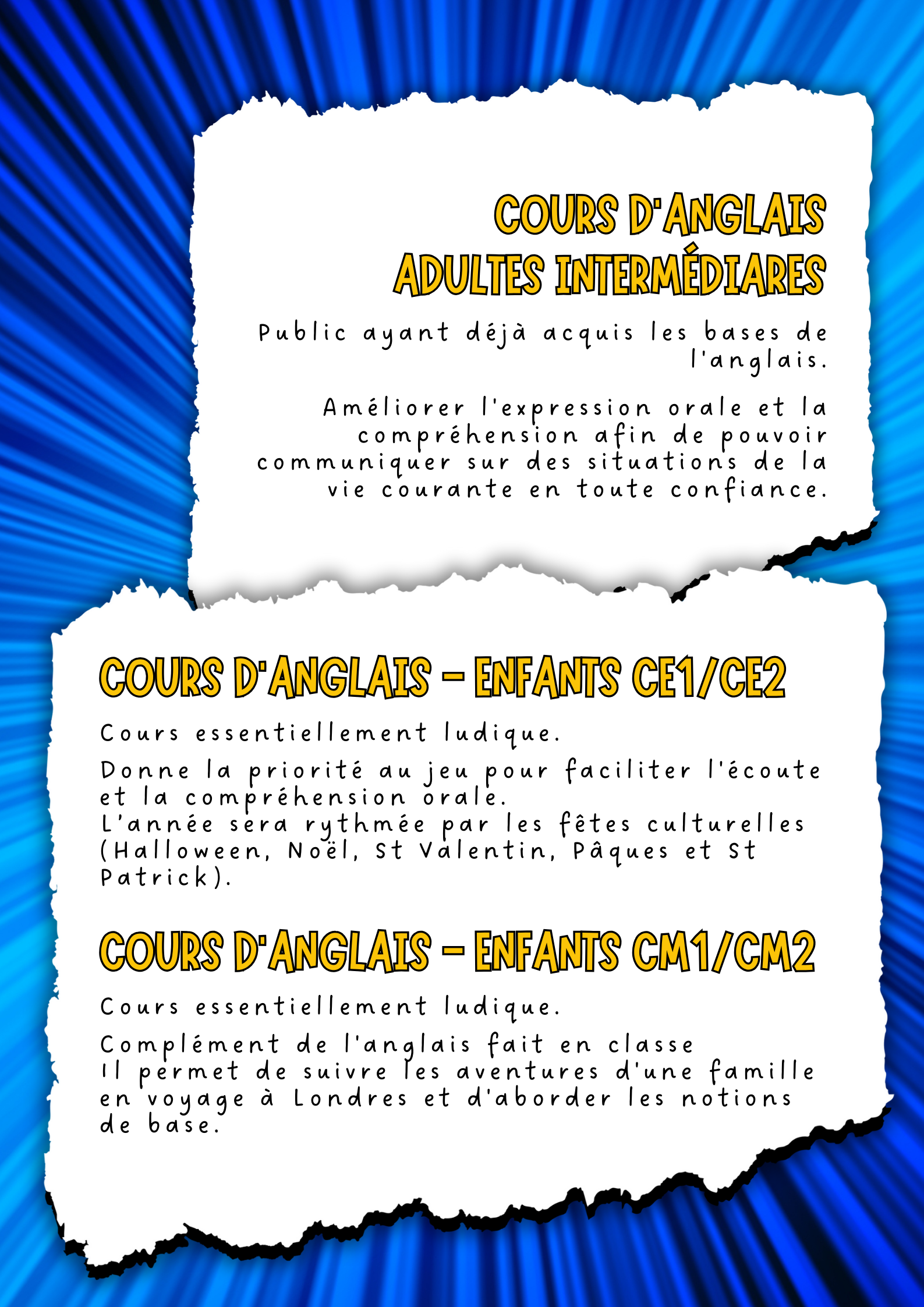 Les cours sont destinés à un public ayant déjà acquis les bases de l'anglais. Il vise à améliorer l'expression orale et la compréhension afin de pouvoir communiquer sur des situations de la vie courante en toute confiance.