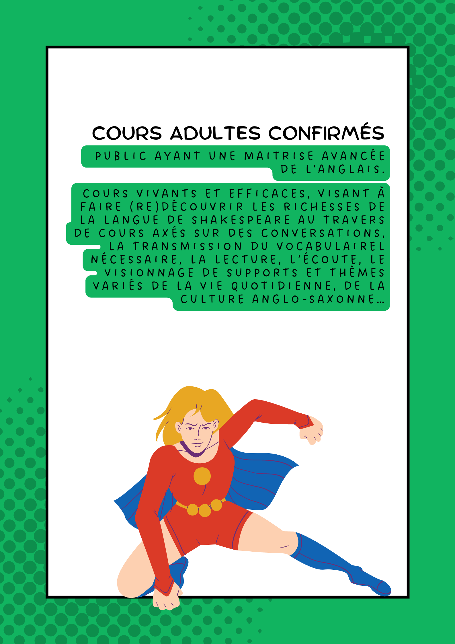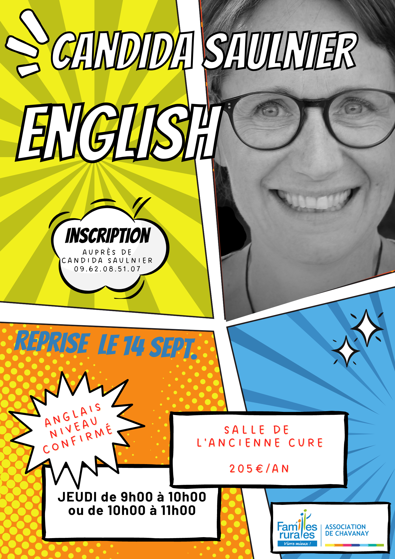 Hatha Yoga Club de marche Pilates Renforcement musculaire - Stretching - Relaxation Renfo. musculaire - Cardio Gym douce - Assouplissement Cours d'anglais - Intermédiaire Cours d'anglais - Confirmé Cours d'anglais - ConfirméCours destinés à un public ayant une maitrise avancée de l'anglais. Les cours sont vivants et efficaces, ils visent à faire (re)découvrir les richesses de la langue de Shakespeare. Tarif210€ l'année + 32€ d'adhésion à l'Association Familles Rurales. Où et quand?Salle de l'ancienne cureLes jeudis de 9h00 à 10h00 ou de 10h00 à 11h00.Démarrage des cours le 17/09/2025 Les coursLe premier cours d'essai est gratuit.Cours dispensés par Candida Saulnier. InscriptionsInscription pour l'année.Inscription directement auprès de l'enseignante Mme Candida Saulnier au 09.62.08.51.07