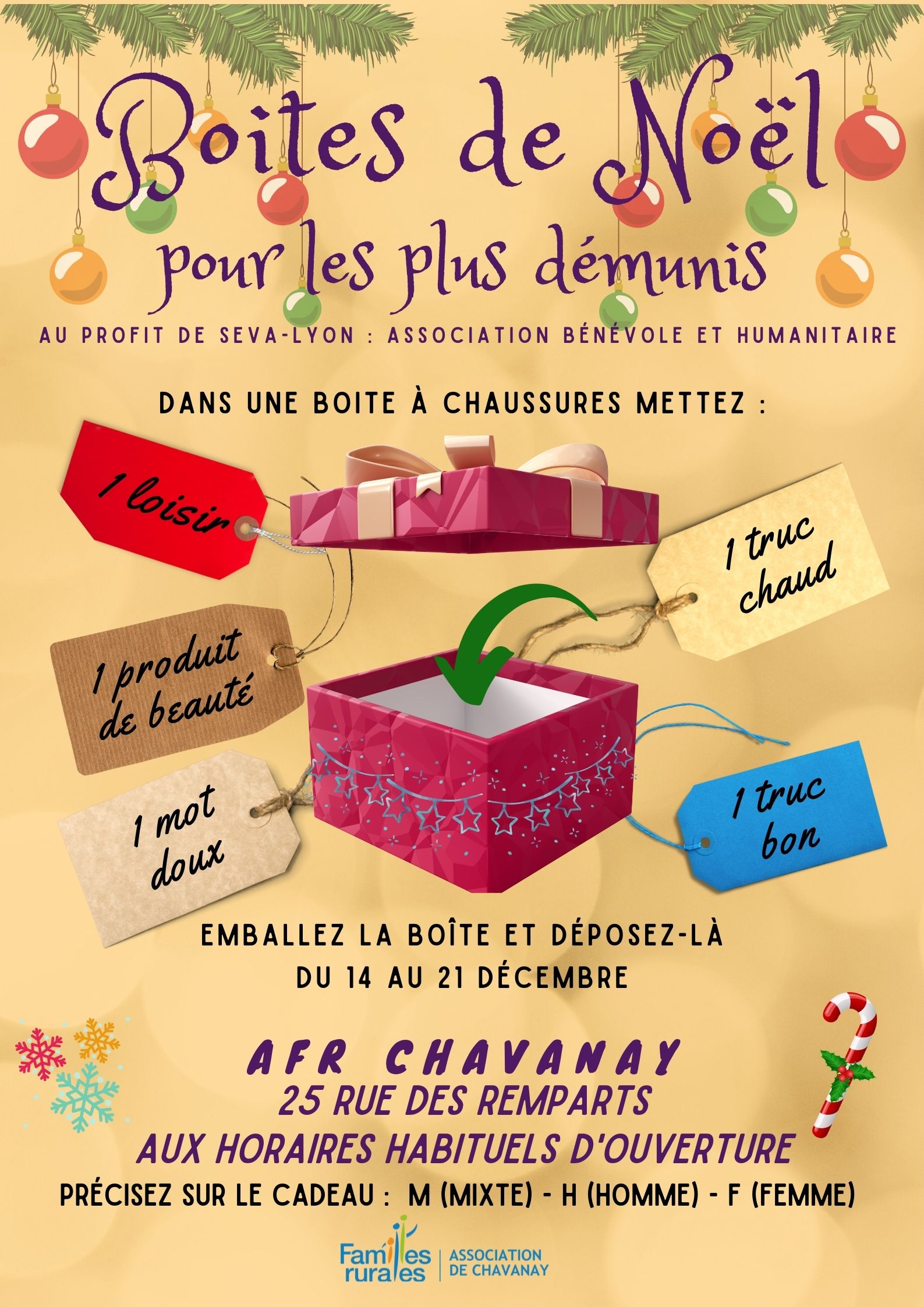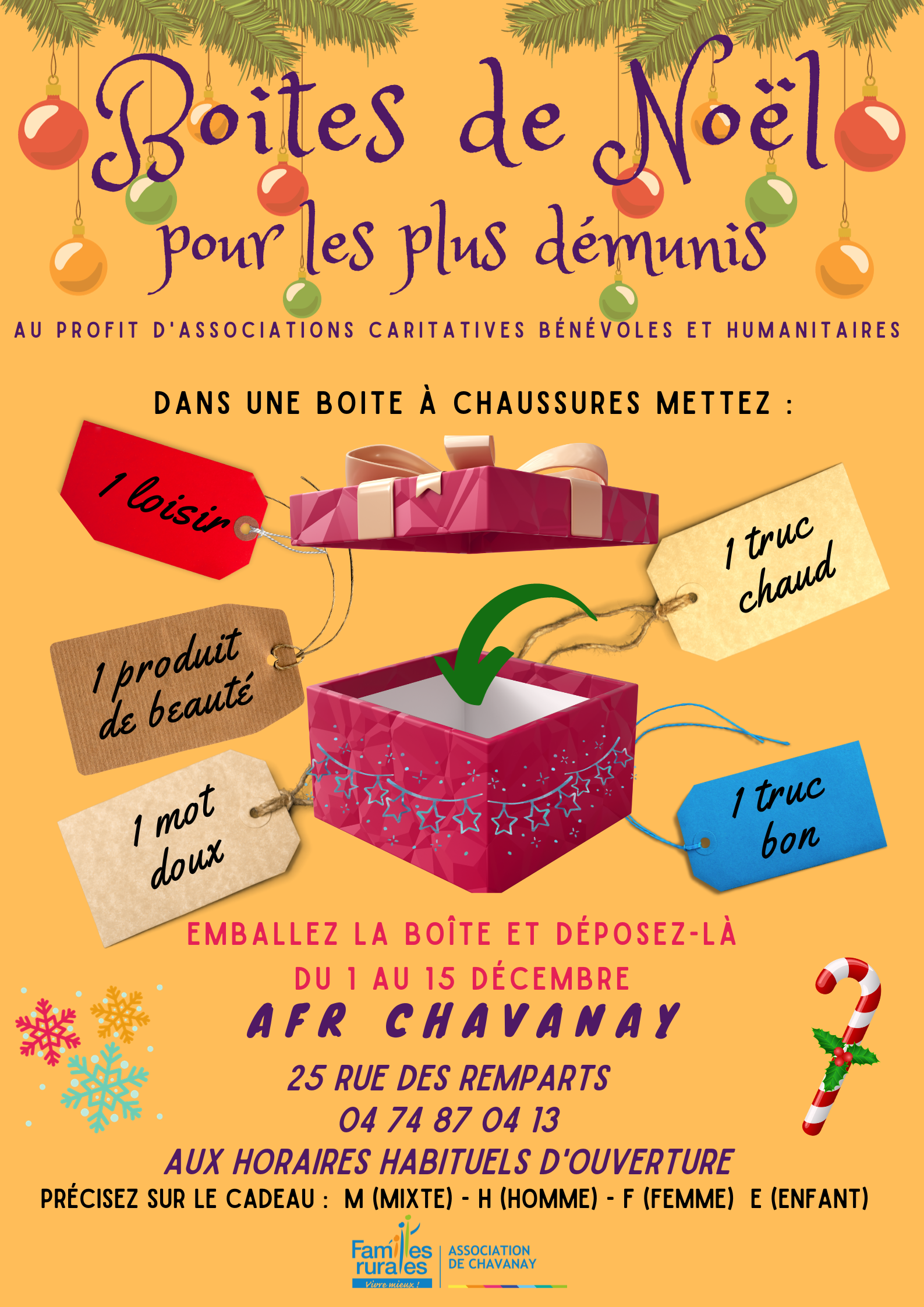 Du 1er au 15 décembre, l'Association Familles Rurales de Chavanay organise une récolte de boîtes de Noël au profit des Restos du Coeur de Maclas.
