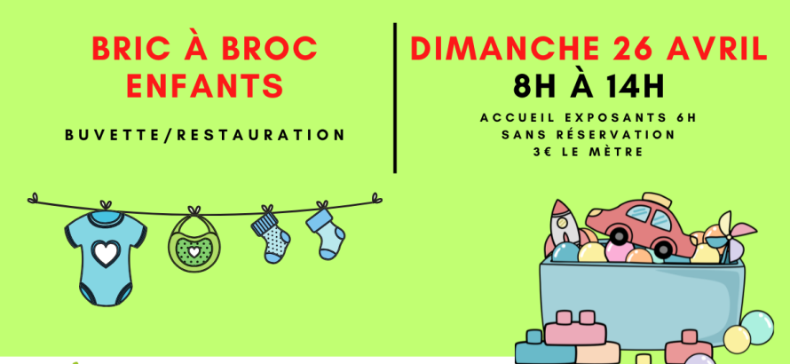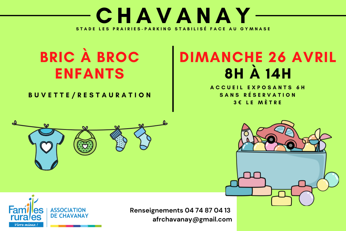 BRIC A BROC BEBE A Chavanay le dimanche 26 avril de 8h à 14h 31 mars 2025 Venez exposer ou acheter !Plus d'infos : Cliquez ici En savoir plus Fiche d'inscription à préremplir pour gagner du temps. Sinon il en sera distribué sur place!197.34 Ko