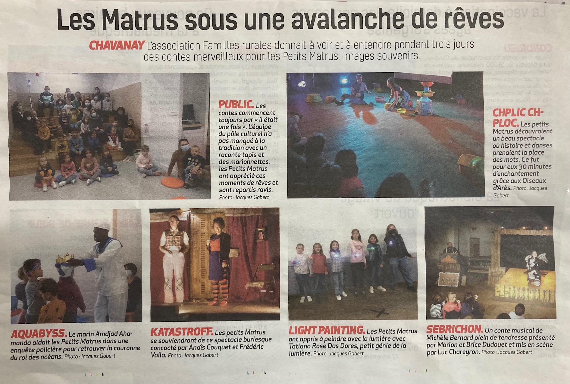 Type de média Presse Date de parution jeu 21/10/2021 - 12:00 Auteur Jacques Gabert Domaine(s) Petite enfance Jeunesse Enfance Loisirs & culture / Développement local et vie sociale Description Article du Réveil du Vivarais sur le weekend petites Matrus Photo