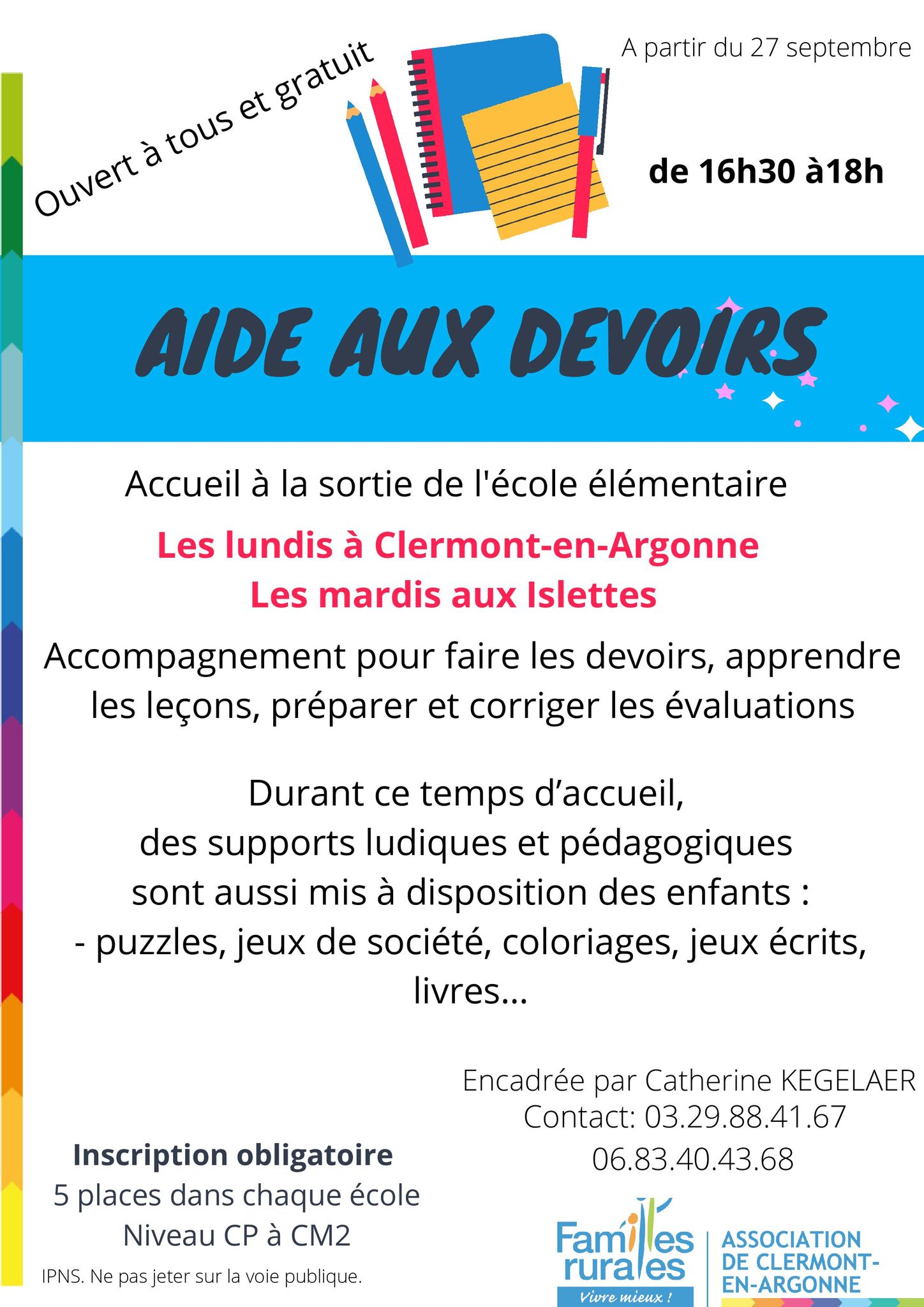 Catherine, salariée de l'association, se rend les lundis à l'école de Clermont-en-Argonne et les mardis à l'école des Islettes, pour accompagner les enfants de primaire (du CP au CM2) dans la réalisation de leurs devoirs.