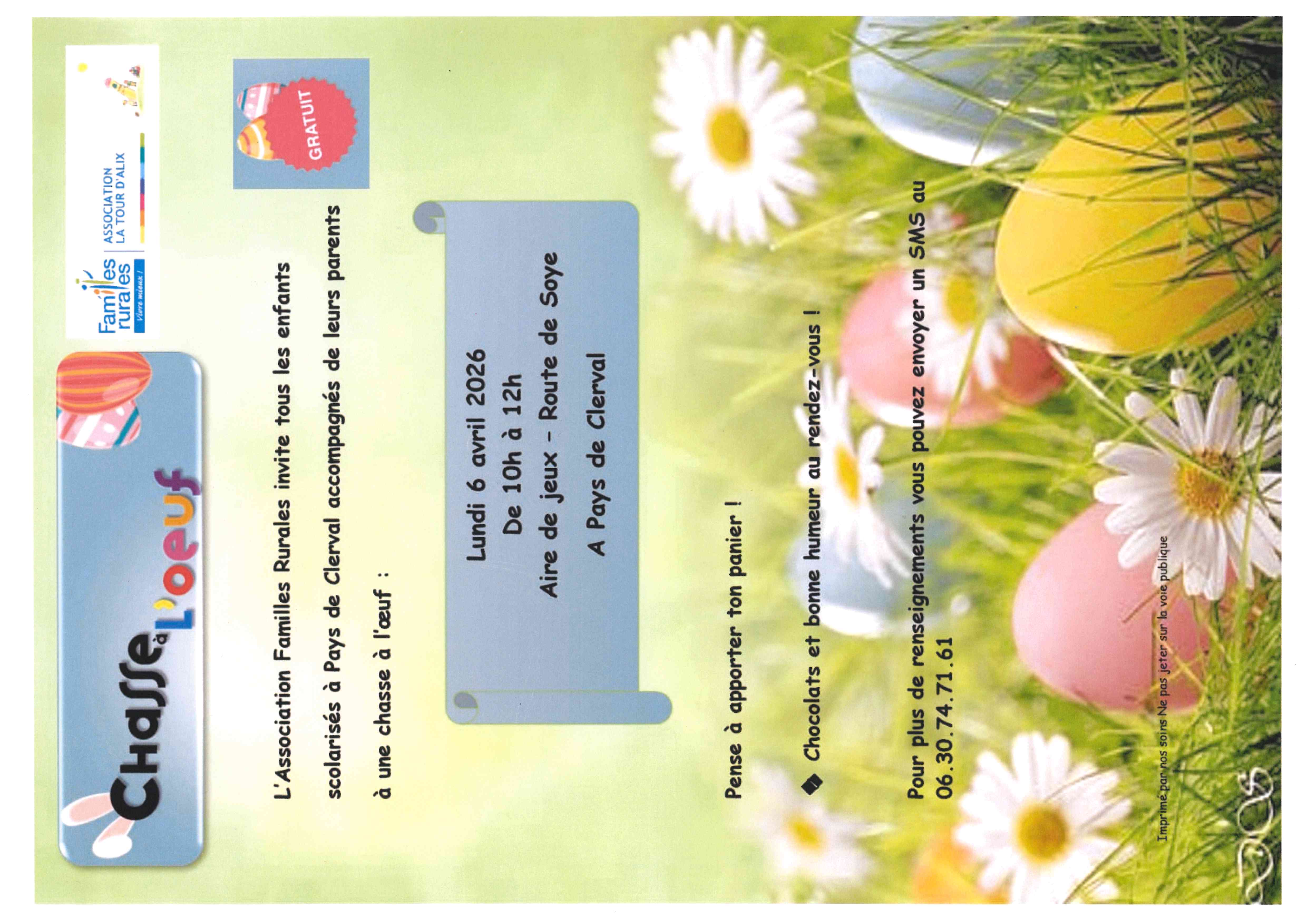 L'association Familles Rurales invite tous les enfants scolarisés à Pays de Clerval accompagnés de leurs parents à une chasse à l'oeuf.