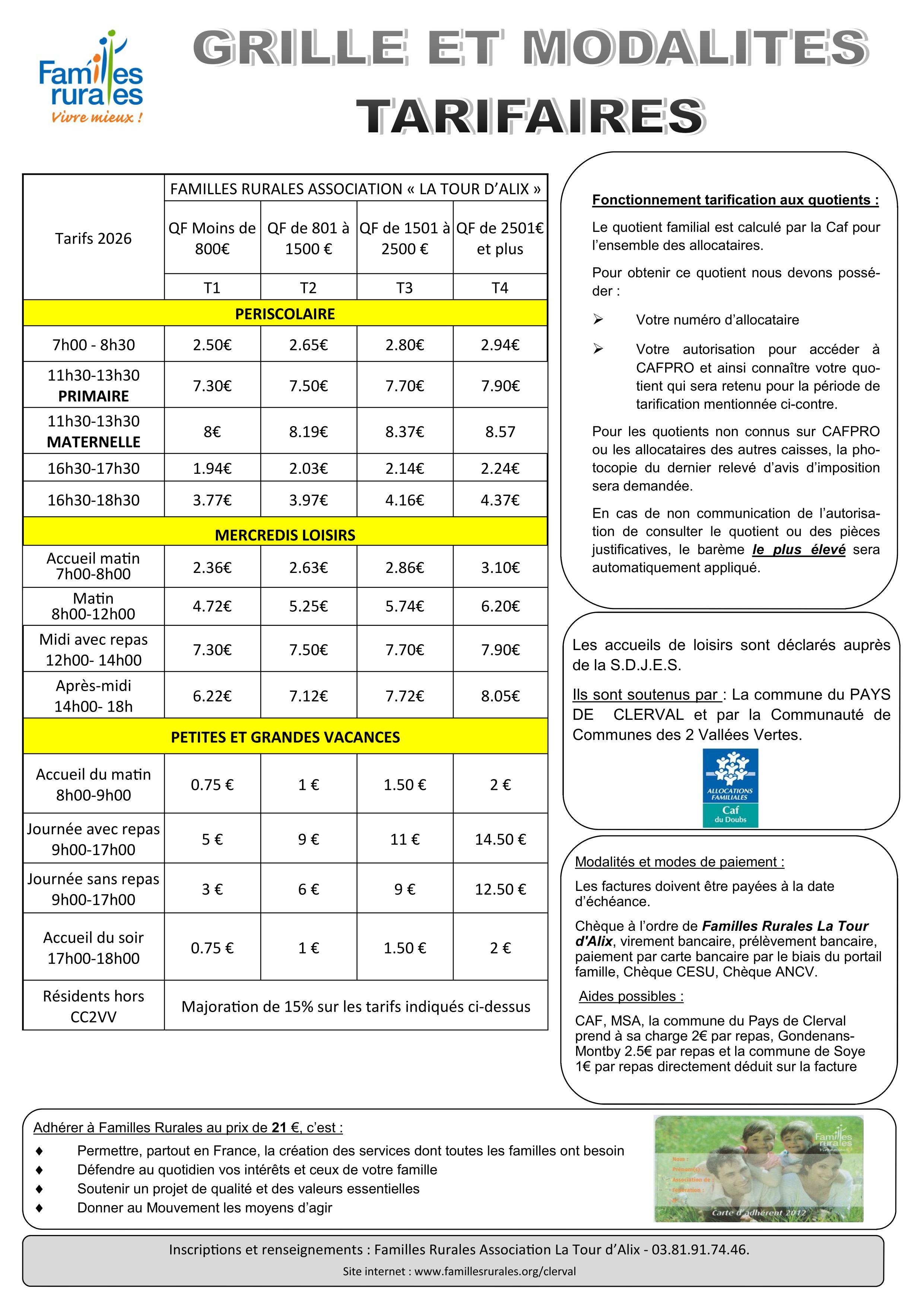 2 B route de Soye CLERVAL 25340 PAYS DE CLERVAL / 03.81.91.74.46 / 06.79.98.27.25 / asso.tourdalix@famillesrurales.org