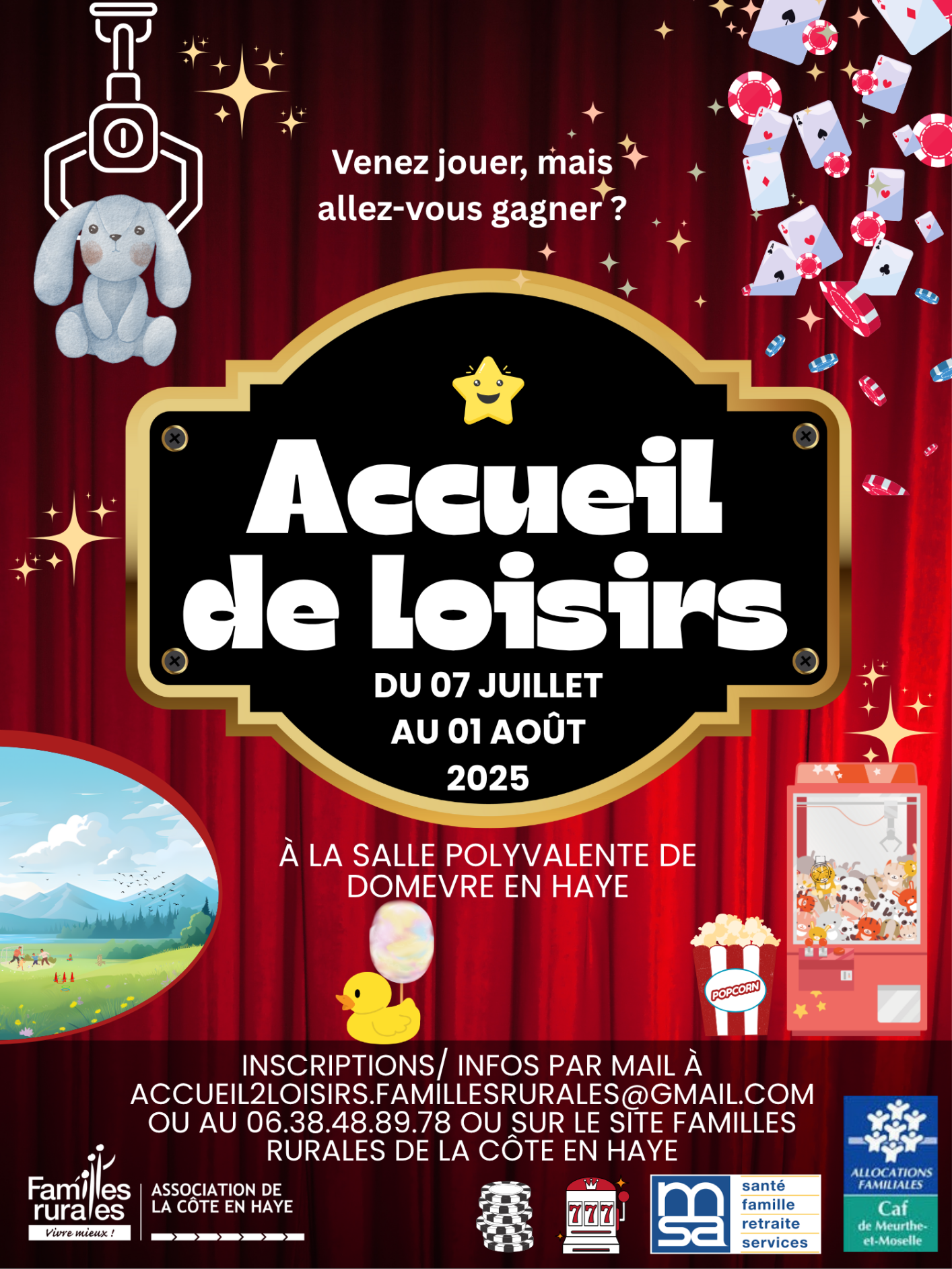 Une équipe d'animateurs prendra en charge vos enfants à la salle polyvalente de Domèvre en Haye de 9h à 17h avec possibilité de garderie de 7h30 à 9h et 17h à 18h30