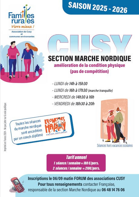 ACCOMPAGNATEUR : Patrice LEVEQUERESPONSABLE : Françoise BENHAIM-KRAJECKY 0648147606INSCRIPTIONS : Au Forum des associations au foyer communal de CUSY,TARIFS : 180 €/an sachant qu'il faut 15 personnes pour ouvrir un créneau