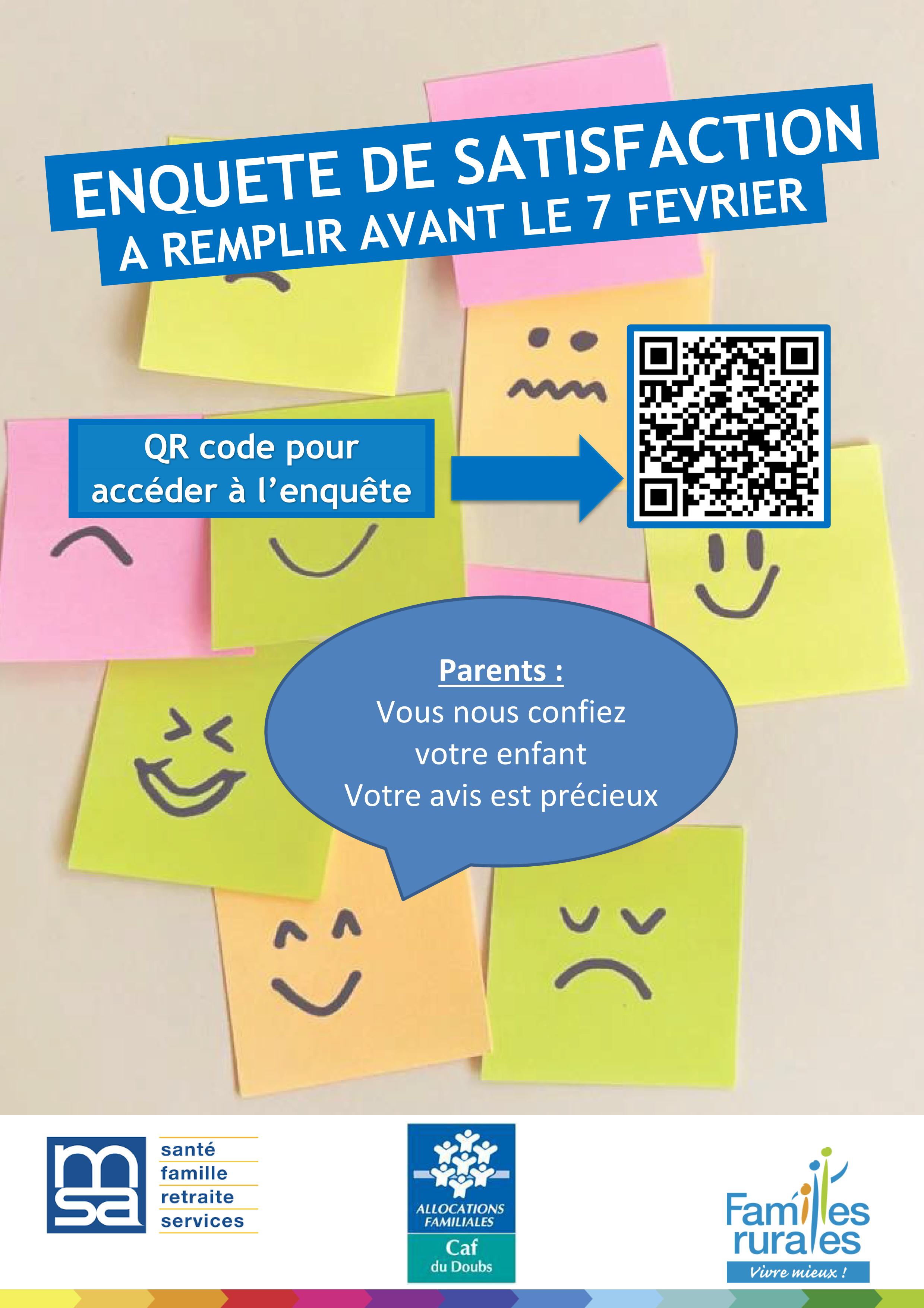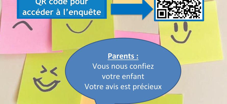 Votre enfant est accueilli dans notre structure. Acceptez-vous de répondre à l’enquête de satisfaction (temps estimé 3 minutes) en cliquant sur le lien ou en scannant le QR Code ci-dessous avant le 7 février .