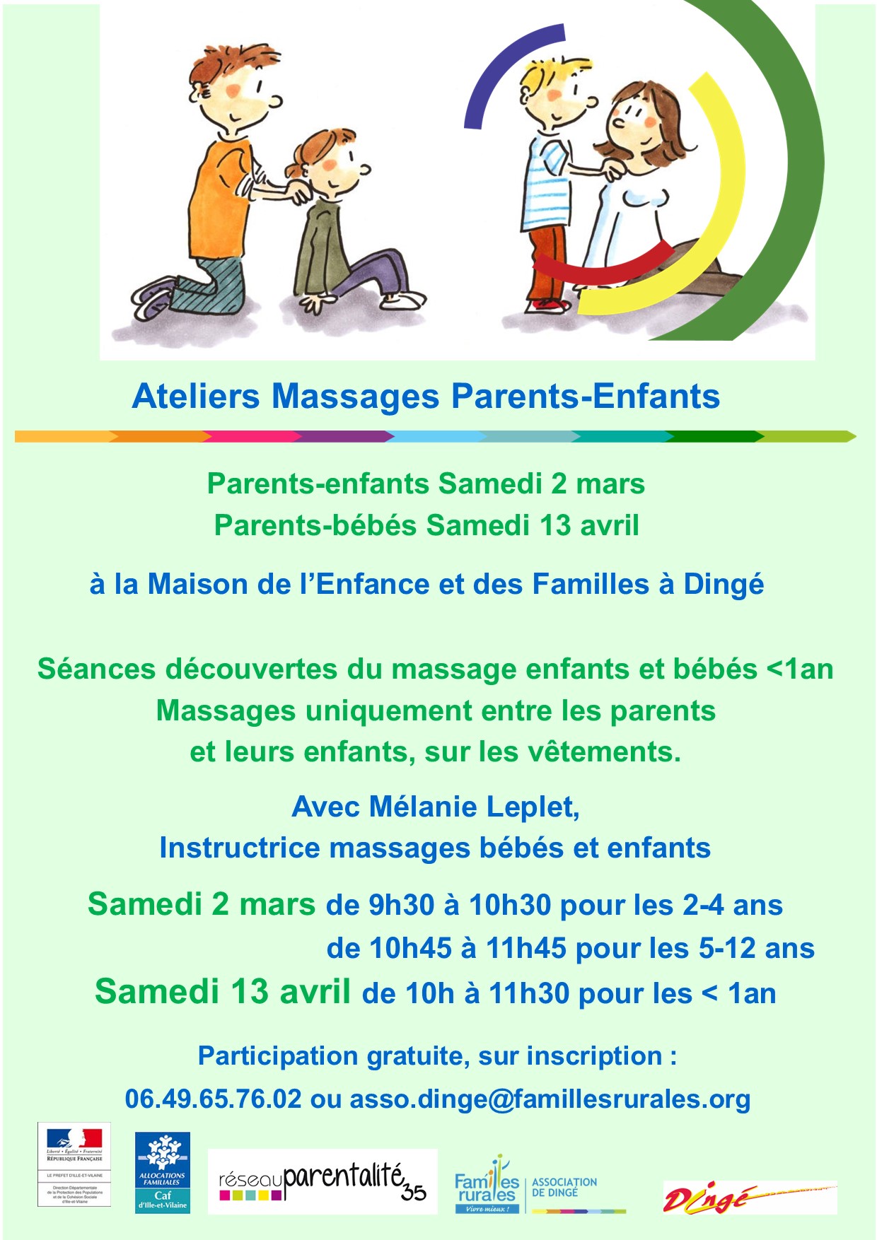Apprenez à masser votre bébé en famille. Masser son bébé permet de vivre des instants privilégiés avec son enfant, les aînés peuvent apprendre à masser leur petit frère/sœur, cela peut favoriser leur complicité, apaiser les tensions. Masser son bébé peut soulager ses douleurs digestives, dentaires, améliorer le sommeil, etc.