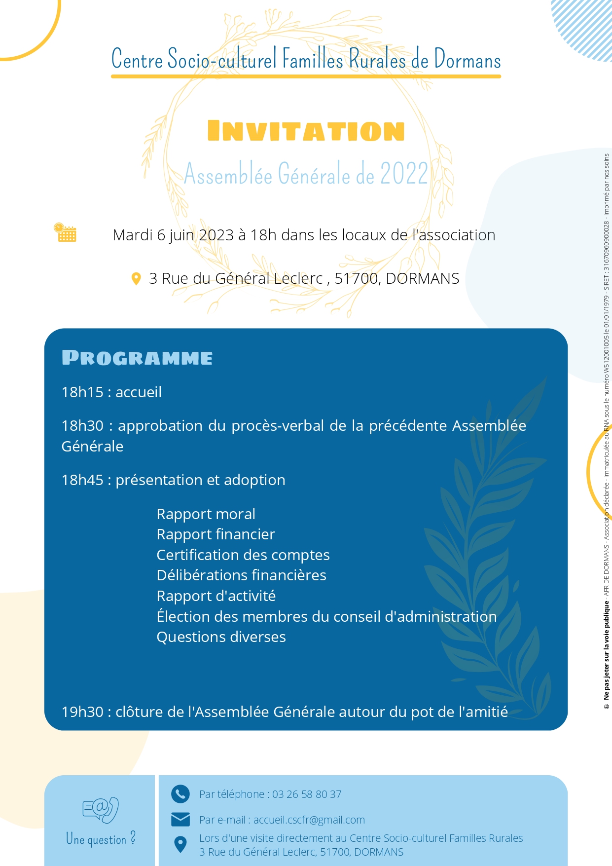 Le conseil d'administration du Centre Socio Culturel Familles Rurales de Dormans a le plaisir de vous convier à son Assemblée Générale 2022.