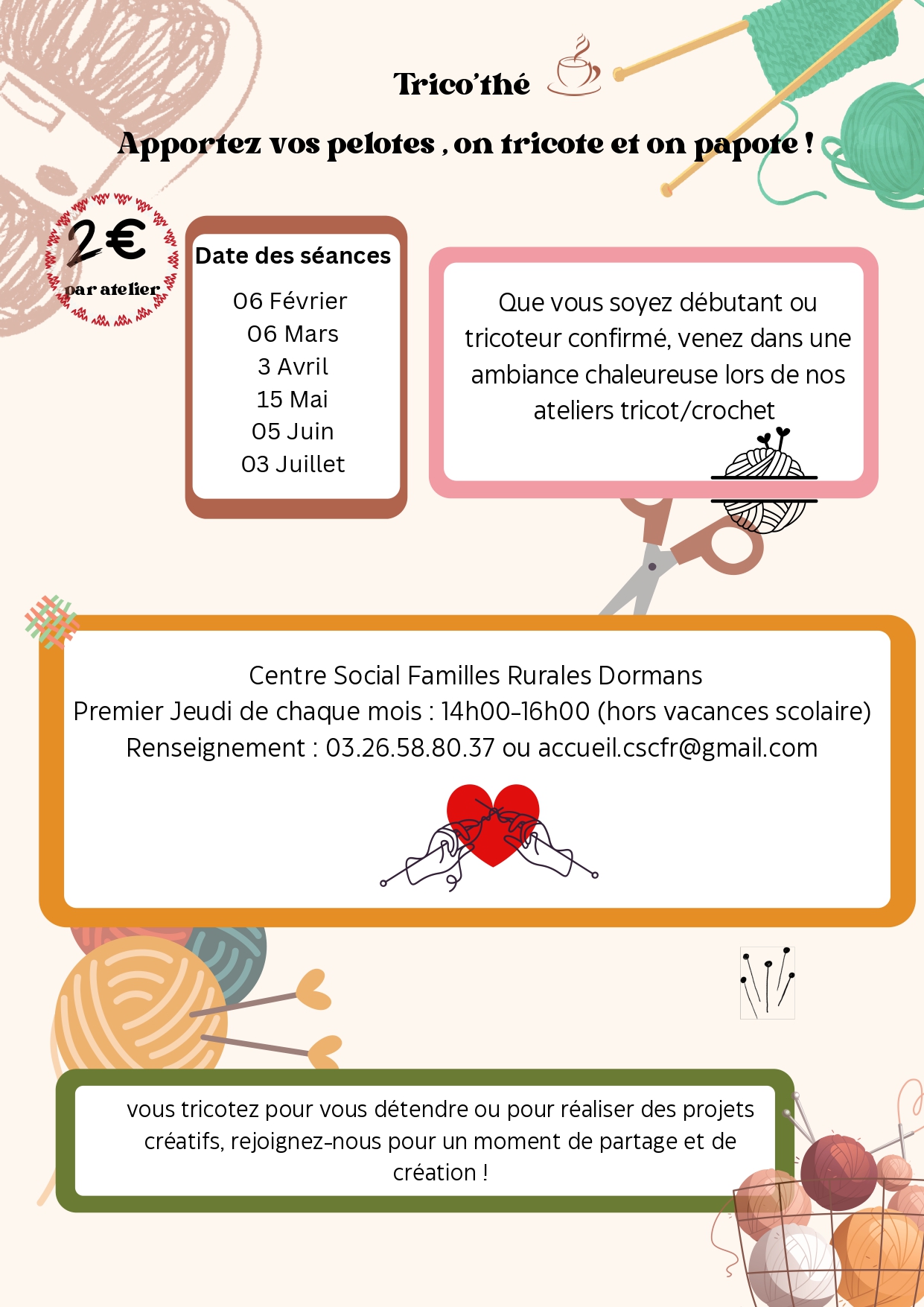 Atelier Tricot - Ouvert à Tous Pas de professionnels, pas de pression, juste l’envie de passer un bon moment et d’échanger vos astuces, idées, et savoir-faire. Que vous soyez débutant ou expérimenté, l’important est de créer, d’apprendre et de s’amuser. Qui sait ? Peut-être que de nouvelles passions naîtront autour de ce cercle chaleureux ! Venez partager un moment convivial et créatif ! 📅 Début : jeudi 06 février 🧶 Ouvert à tous les niveaux 📍 Centrez social Familles Rurales Dormans ⏰ 14h00/16h00 Apportez vos aiguilles et pelotes ! Un temps d’échange, d’apprentissage et de détente autour du tricot. Inscription / Plus d’infos : accueil.cscfr@gmail.comou 03.26.58.80.37