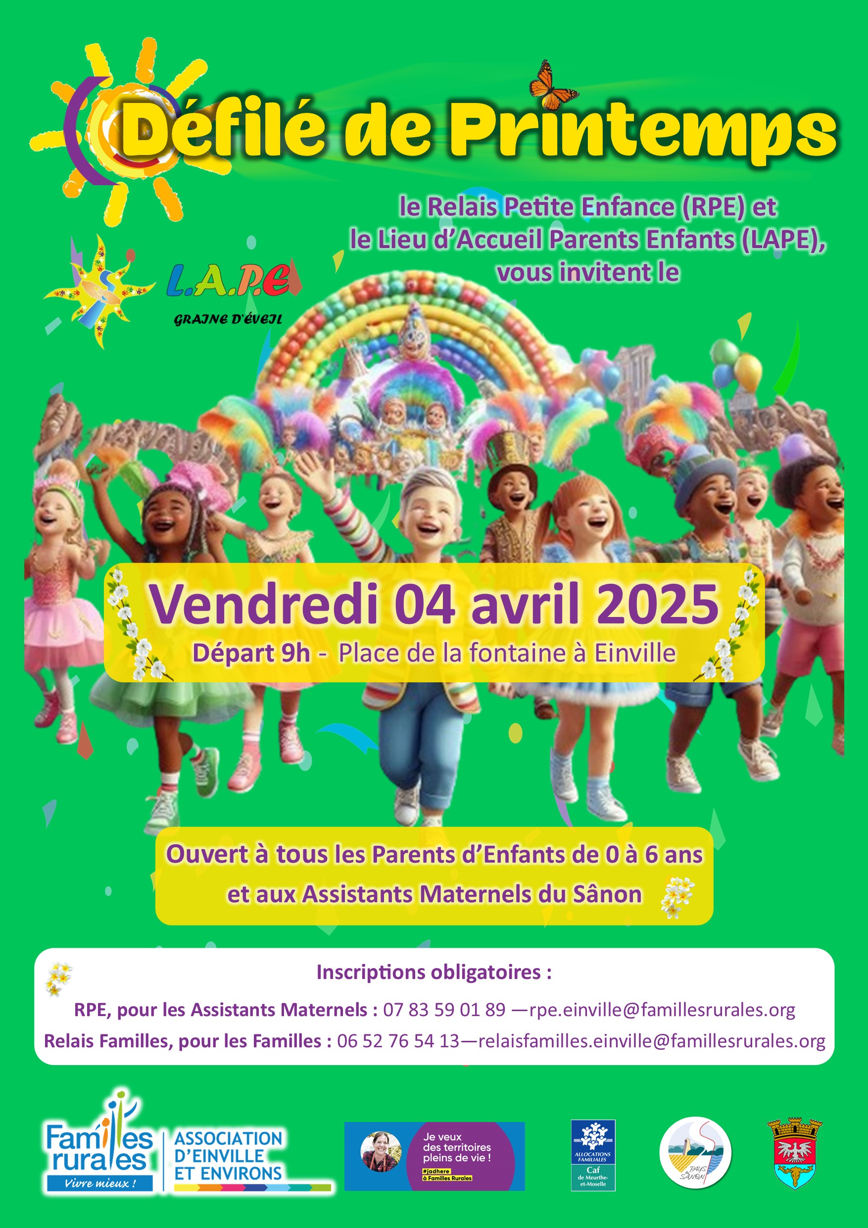Le Relais Petite Enfance (RPE) et le Lieu d’Accueil Parents Enfants (LAPE) vous invitent à célébrer l’arrivée du printemps avec un défilé haut en couleur !