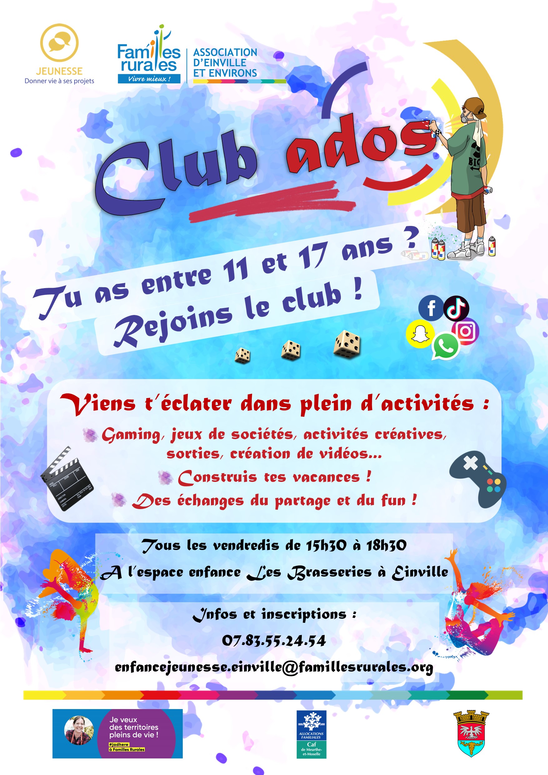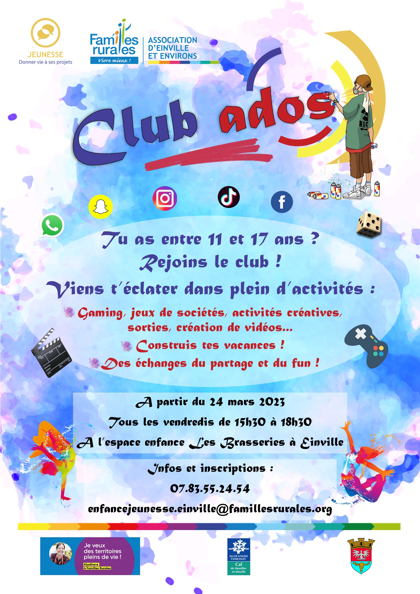 Le Club Ados, c'est tout d'abord, un espace de rencontre pour les jeunes de 11 à 17 ans, animé par Pascal, où les jeunes peuvent se retrouver tous les vendredis (en période scolaire) de 15 h 30 à 18 h 30 à l'Espace Enfance "Les Brasseries" à Einville, pour passer un moment convivial entre jeunes !
