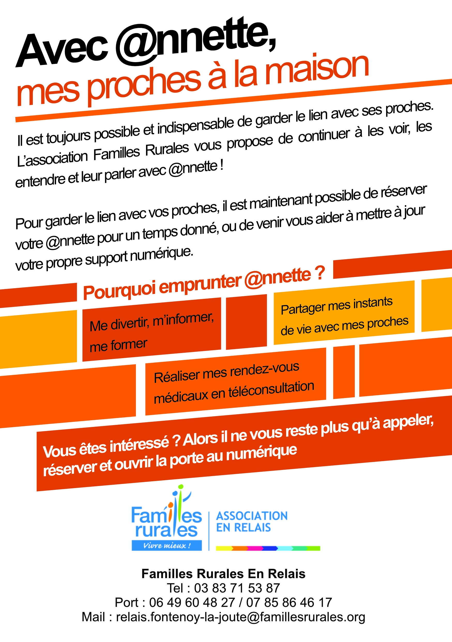 L’association Familles Rurales en Relais vous propose un nouveau service totalement gratuit : @nnette la tablette.