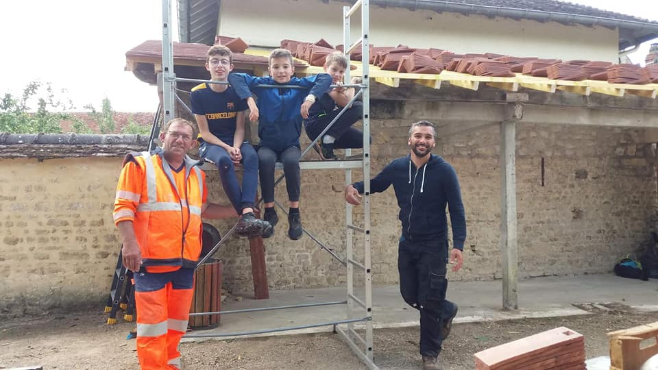 Réfection de la toiture d'un ancien lavoir sur la place Valazé d'Essay en juillet 2021: 8 jeunes se sont relayés pendant 3 jours encadrés par Emmanuel Kerveillant et Anthony