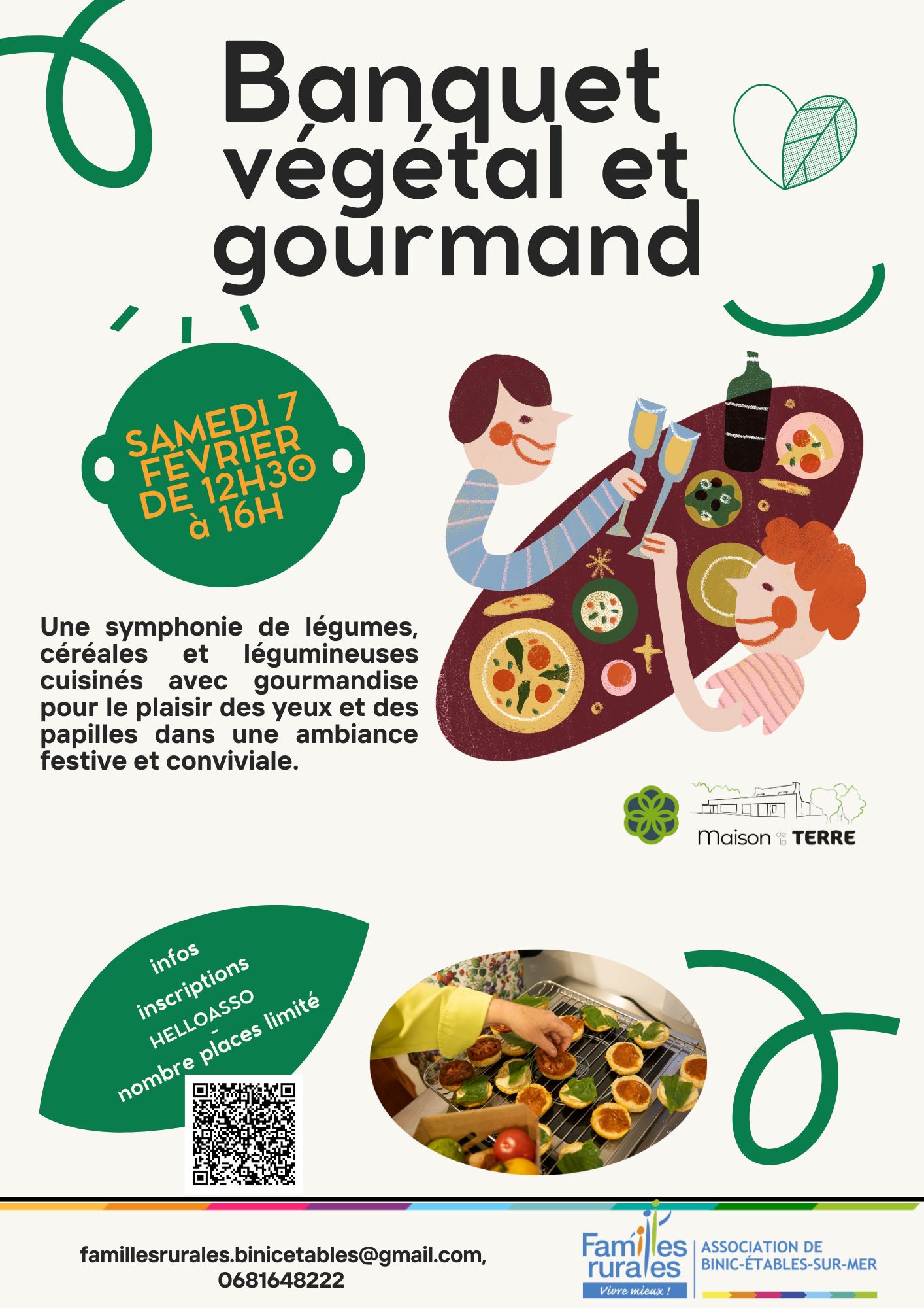 Loin du banquet des 22 000 maires en 1900 au jardin des Tuileries , retrouvons nous pour un banquet "végétal et gourmand" à 50 le samedi 7 février à 12h30 à la Maison de la Terre à Lantic.. Nous aurons le plaisir de vous proposer un repas composé d'une symphonie de légumes, céréales et légumineuses cuisinés avec gourmandise pour le plaisir des yeux et des papilles dans une ambiance festive et conviviale.