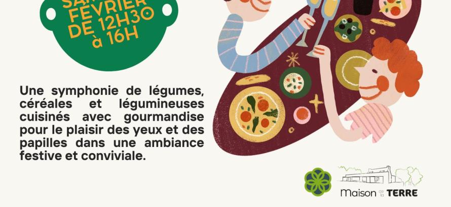 Nous aurons le plaisir de vous proposer un repas composé d'une symphonie de légumes, céréales et légumineuses cuisinés avec gourmandise pour le plaisir des yeux et des papilles dans une ambiance festive et conviviale.