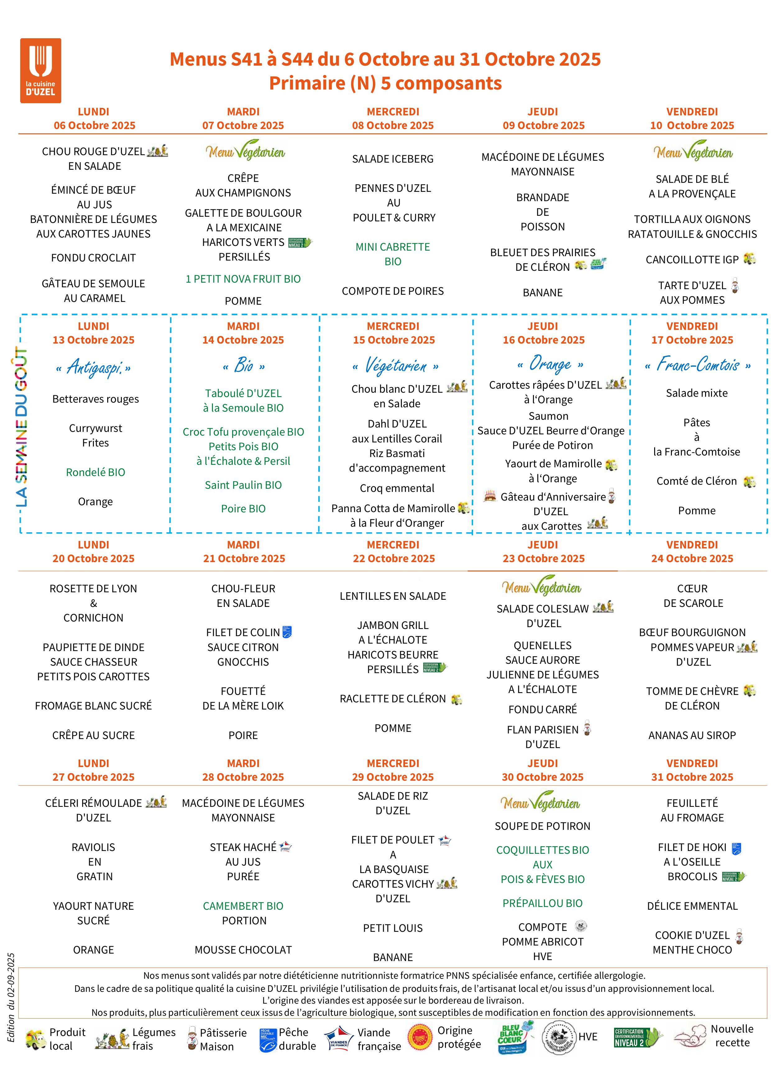 Les repas sont livrés tous les jours en liaison froide par la Cuisine d'Uzel. Ils sont réchauffés sur place, dans notre cuisine selon les normes d'hygiène en vigueur. Ils sont les mêmes pour les maternelles et les primaires et nous proposons des menus adaptés aux régimes alimentaires de chaque enfant.