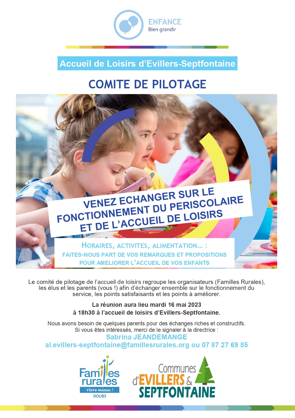 Comité de pilotage Mardi 16 mai 2023 à 18h30 à l'accueil de loisirs 10 mai 2023 En savoir plus affiche_copil_20230516.pdf397.49 Ko