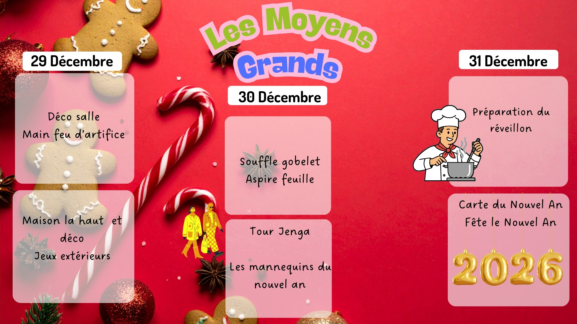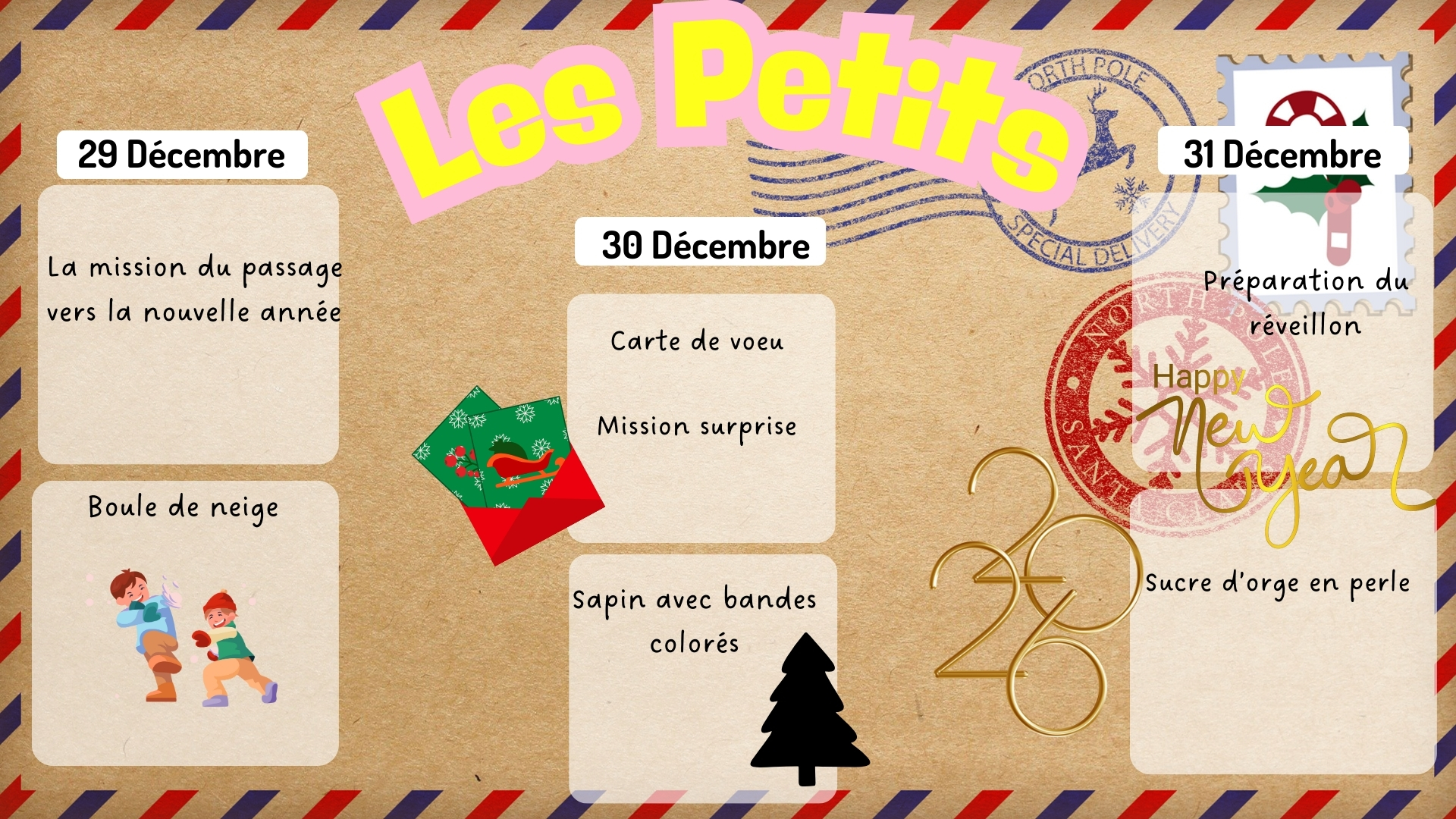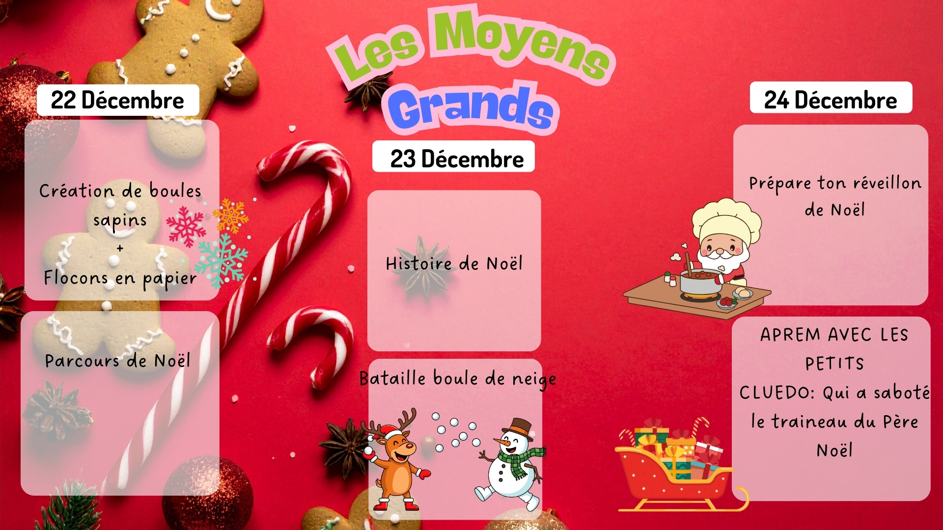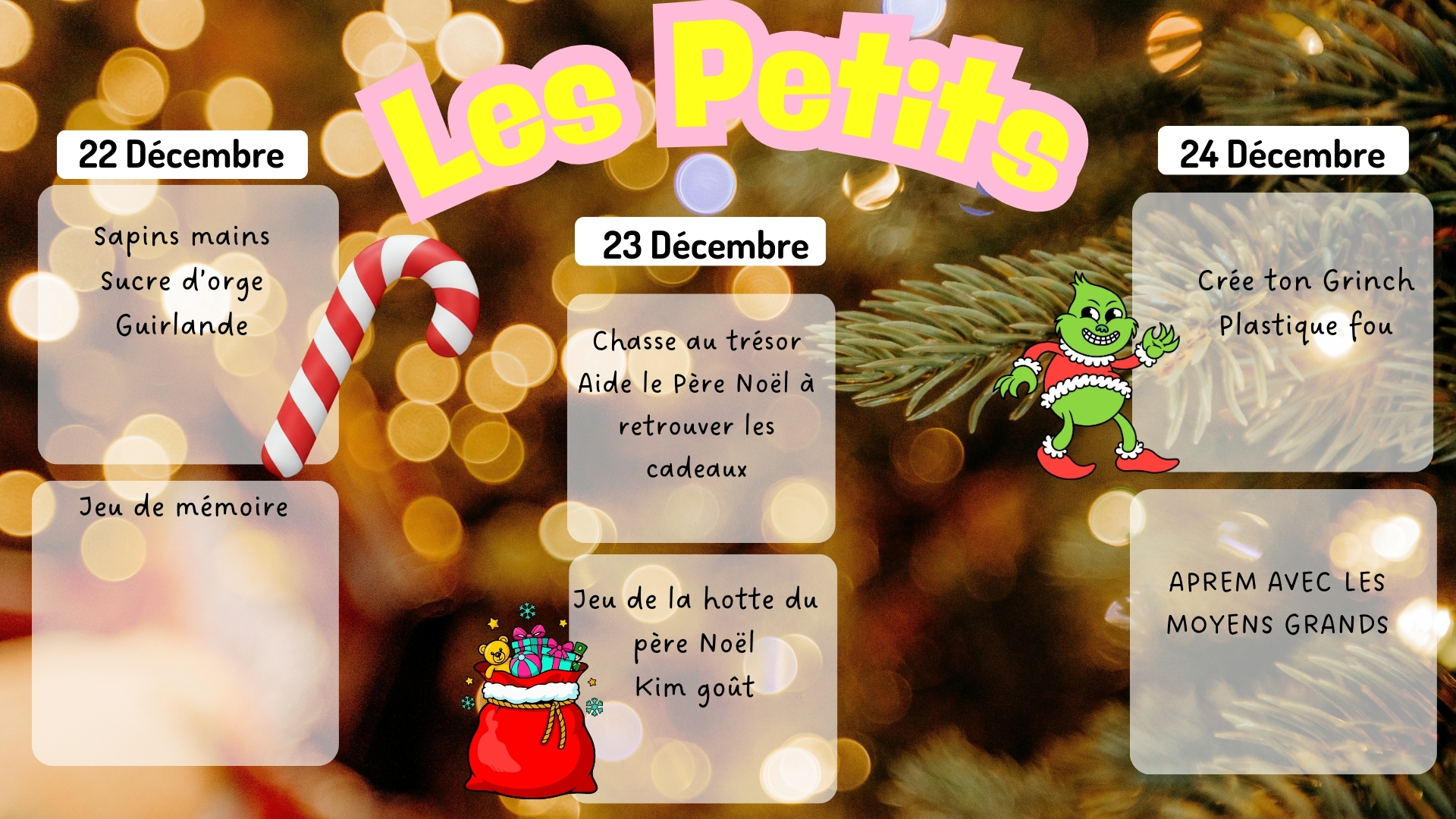 Présentation Inscription Tarifs Programmes des Vacances de Noël RETROUVER LES PROGRAMMES DES 2 SEMAINES DE VACANCES POUR CHAQUE GROUPE DANS L'ONGLET CORRESPONDANT AU GROUPE DE VOTRE ENFANT LES PETITS LES MOYENS LES GRANDS