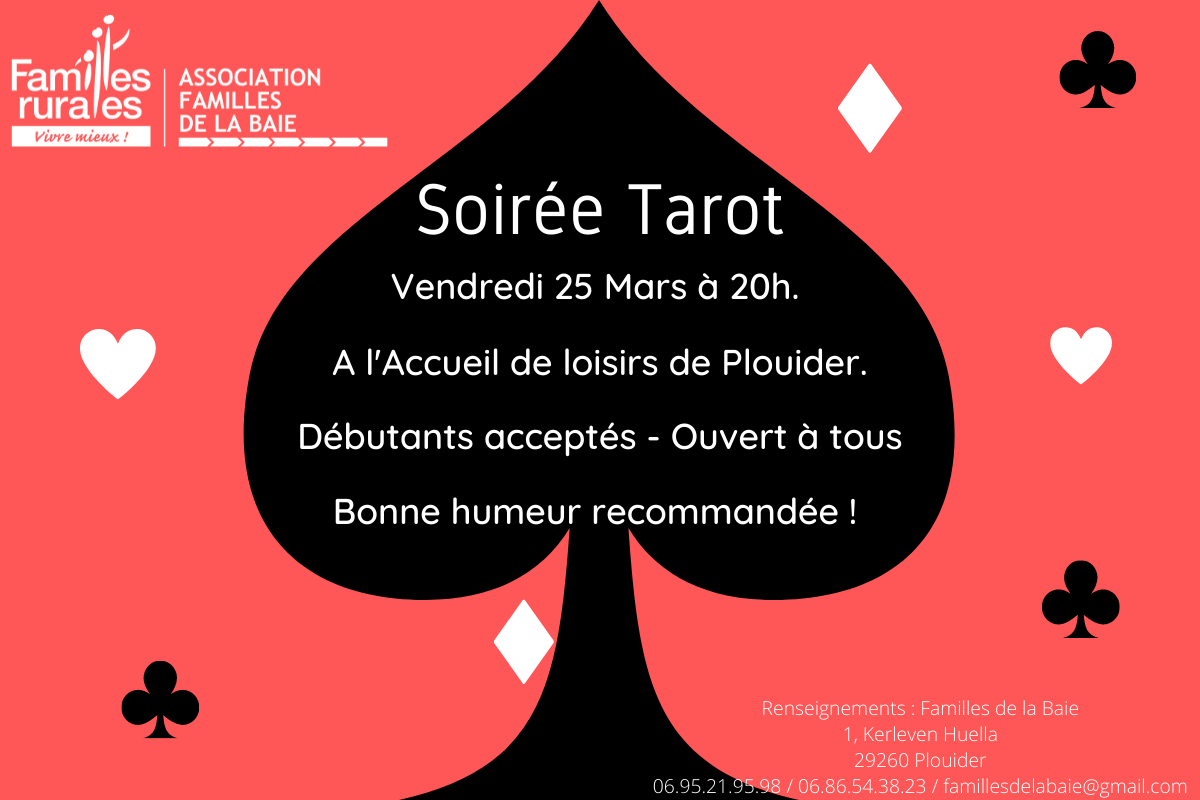 Vendredi 25 mars à partir de 20h, l'association Familles de la Baie et ses joueurs de tarot vous invite à les rejoindre à l'accueil de loisirs afin de disputer quelques bonnes parties de cartes.